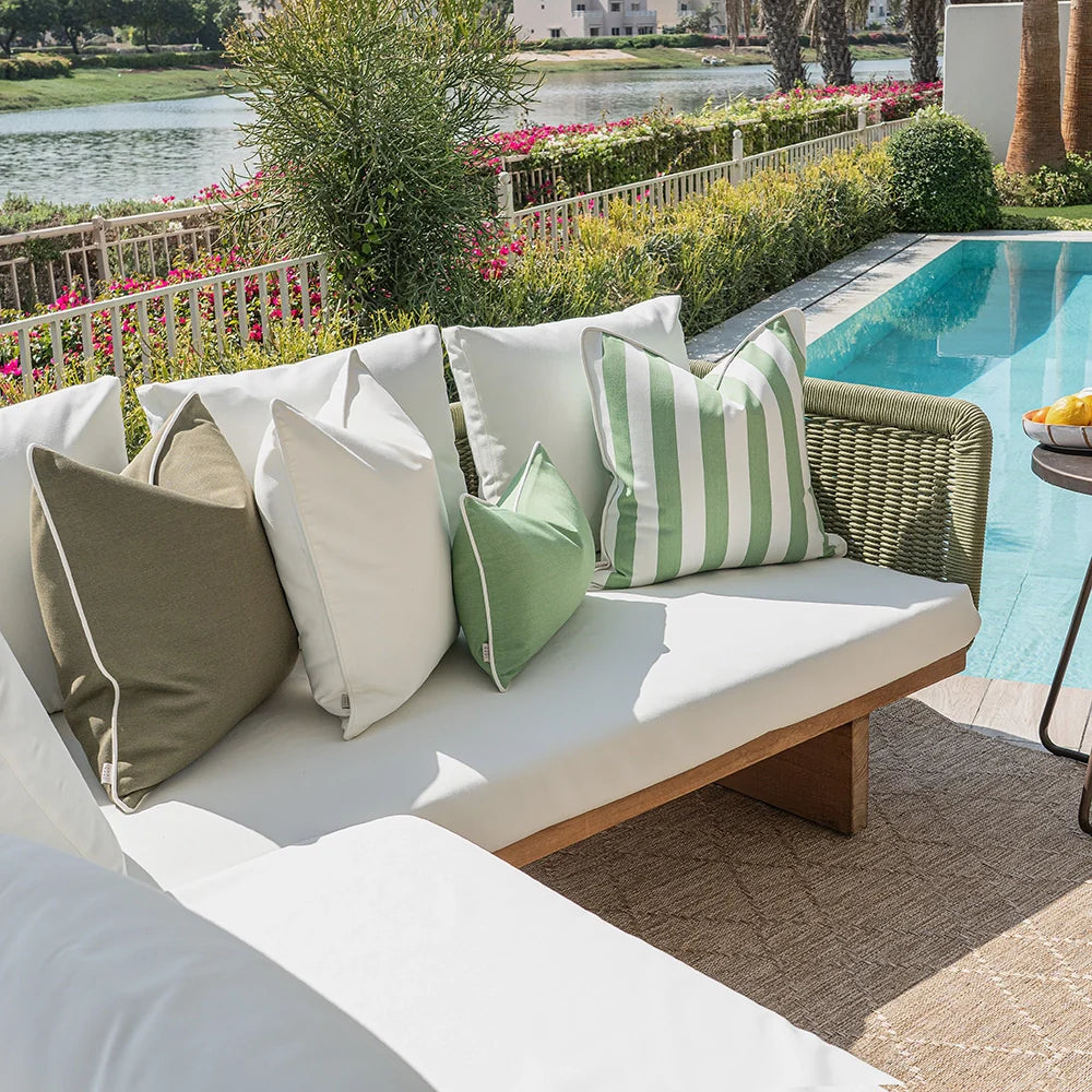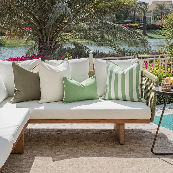 Создайте свой стиль на открытом воздухе с помощью этого комплекта из четырёх подушек. В этом наборе подушек цвета слоновой кости и зелёного цвета сочетаются простые стили с яркой полосатой подушкой, что создаёт по-настоящему современный образ.