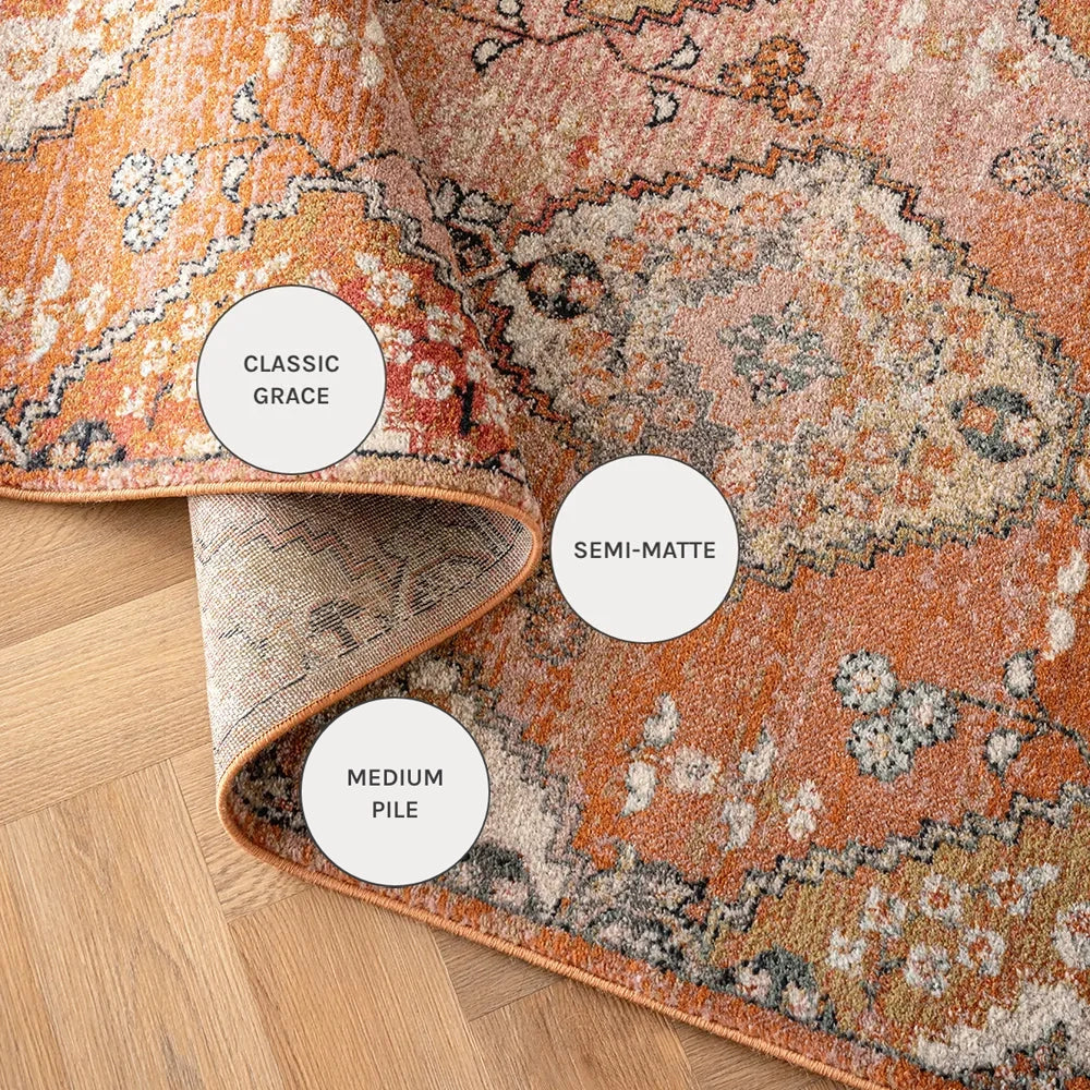 В насыщенных оттенках оранжевого этот ковер с ромбовидным узором имеет красивое свечение. Ковер в винтажном стиле обновляет традиционный дизайн с помощью современных материалов, чтобы создать теплую, привлекательную эстетику в вашем доме.