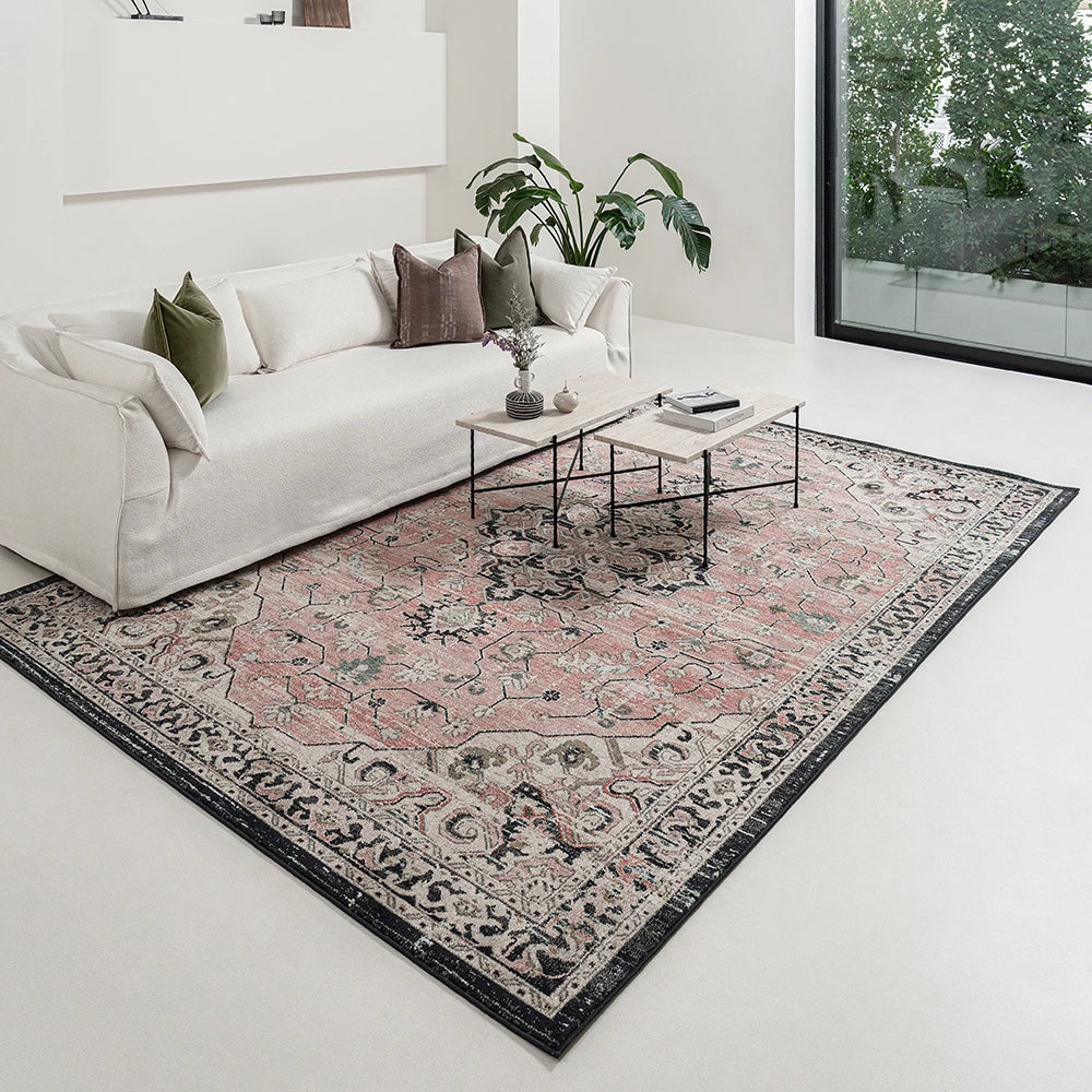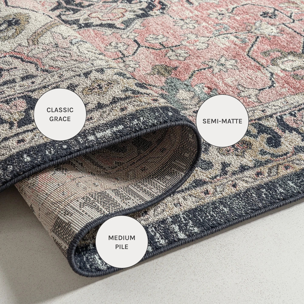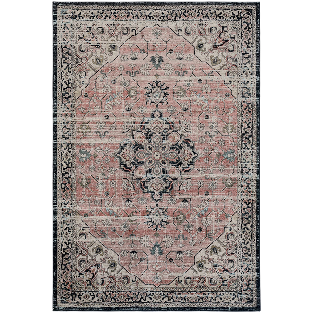 Изысканное сочетание цветов придает этому традиционному ковру с узором особую элегантность. Ковер серого и нежно-розового цвета, обрамленный графитовой каймой, идеально впишется в лаконичный современный интерьер.