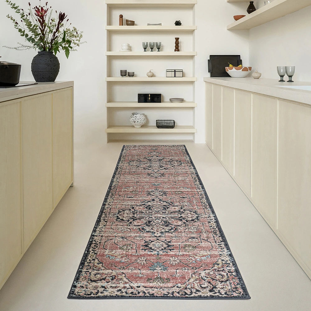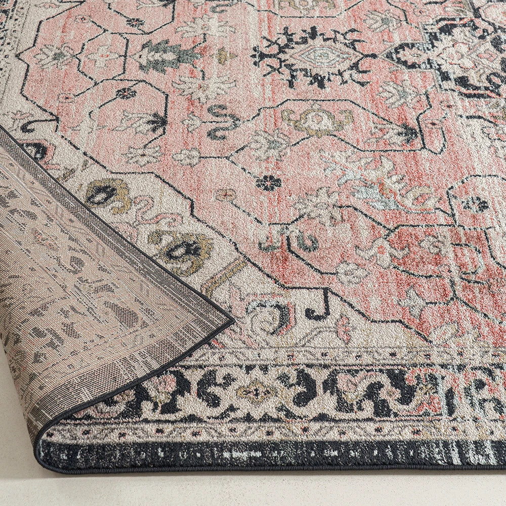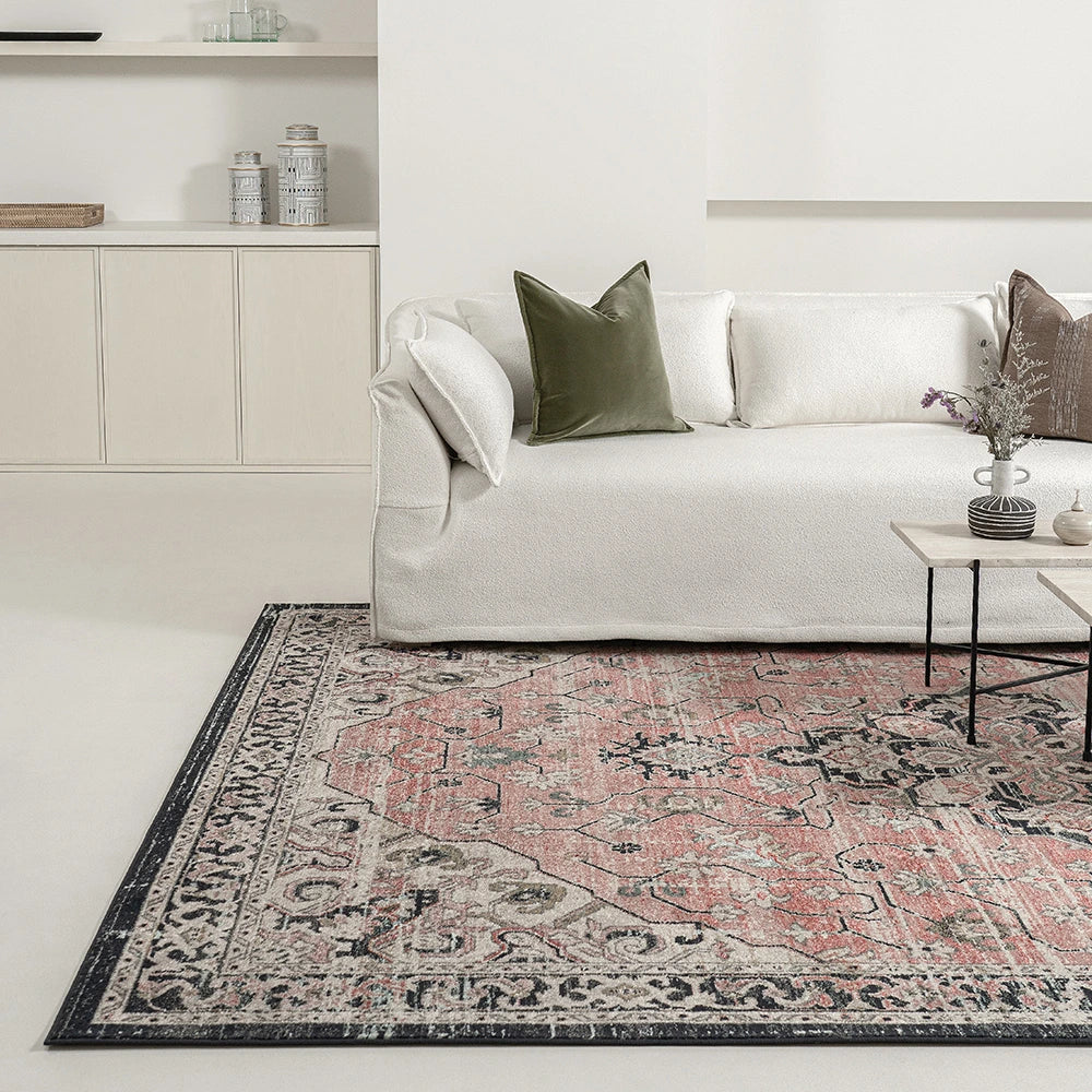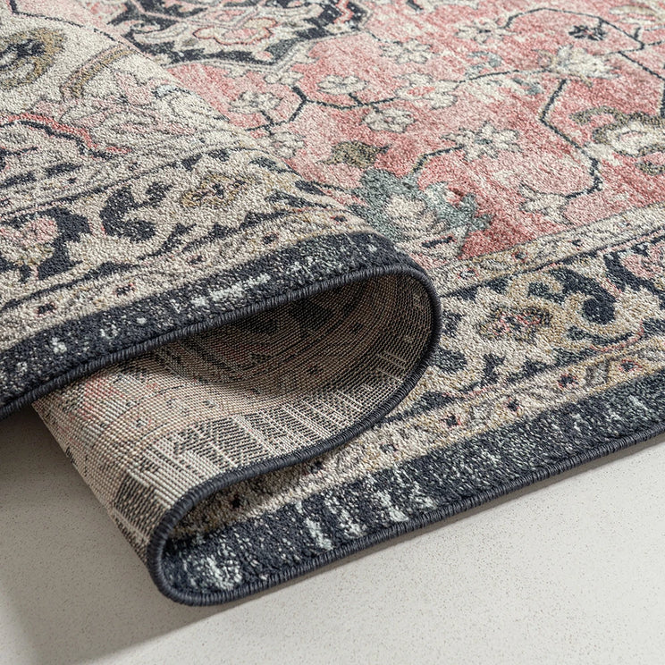 Изысканное сочетание цветов придает этому традиционному ковру с узором особую элегантность. Ковер серого и нежно-розового цвета, обрамленный графитовой каймой, идеально впишется в лаконичный современный интерьер.