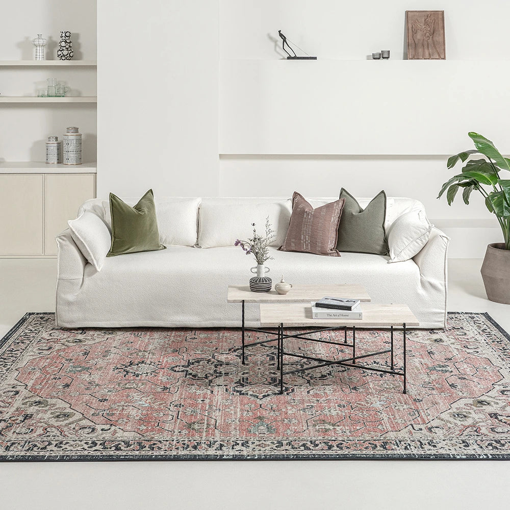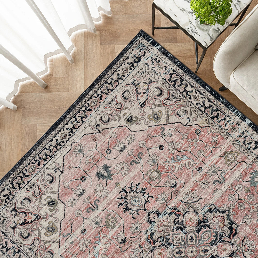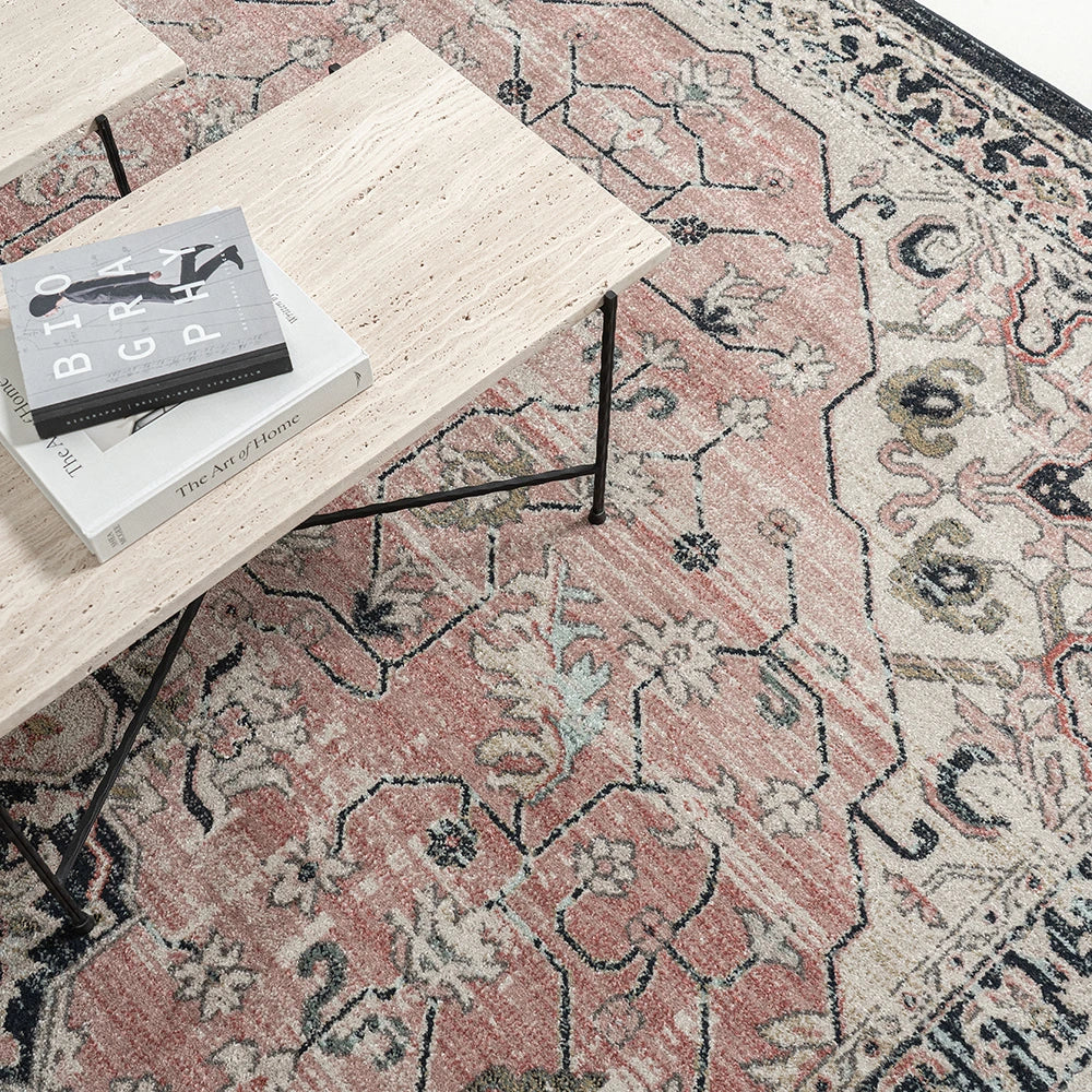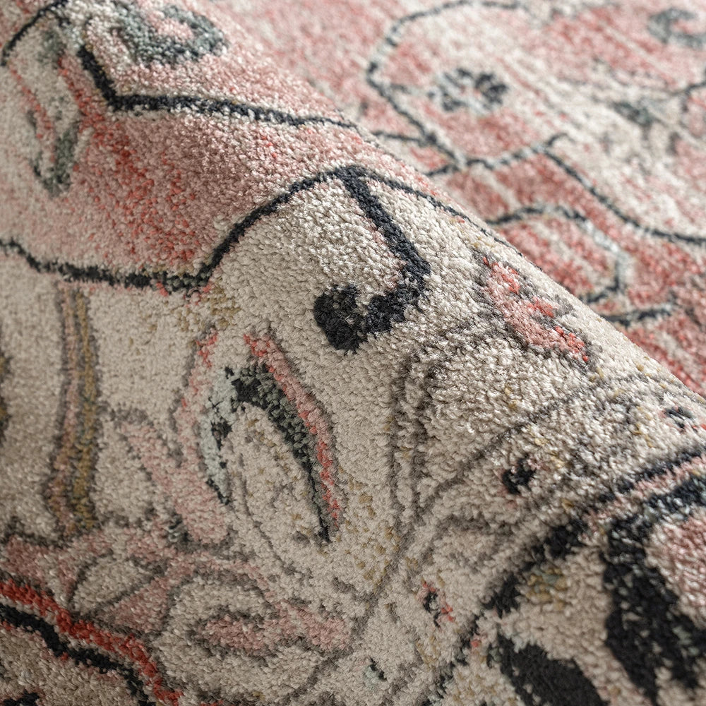Выцветший ковер с медальонами серого и розового цвета