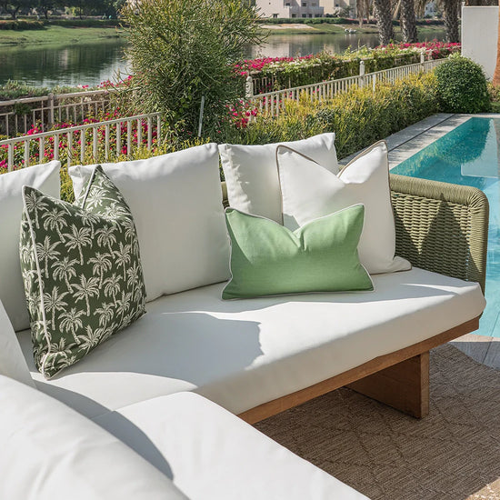 Этот современный комплект подушек одновременно практичен и стильен. Однотонные и узорчатые подушки, предназначенные для использования на открытом воздухе, представлены в оттенках слоновой кости и зелёного, гармонирующих с природой.