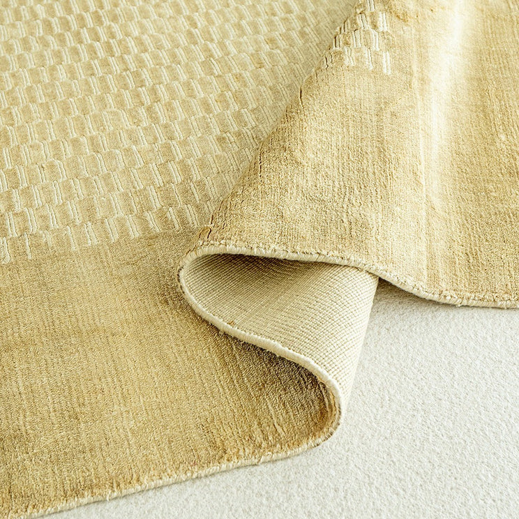 Этот светло-бежевый ковер имеет текстуру, которая улучшит ваш интерьер. Этот полуматовый коврик с текстурированной панелью из прямоугольников тон в тон изготовлен из художественного шелка и обработан вручную для придания ему превосходного вида.