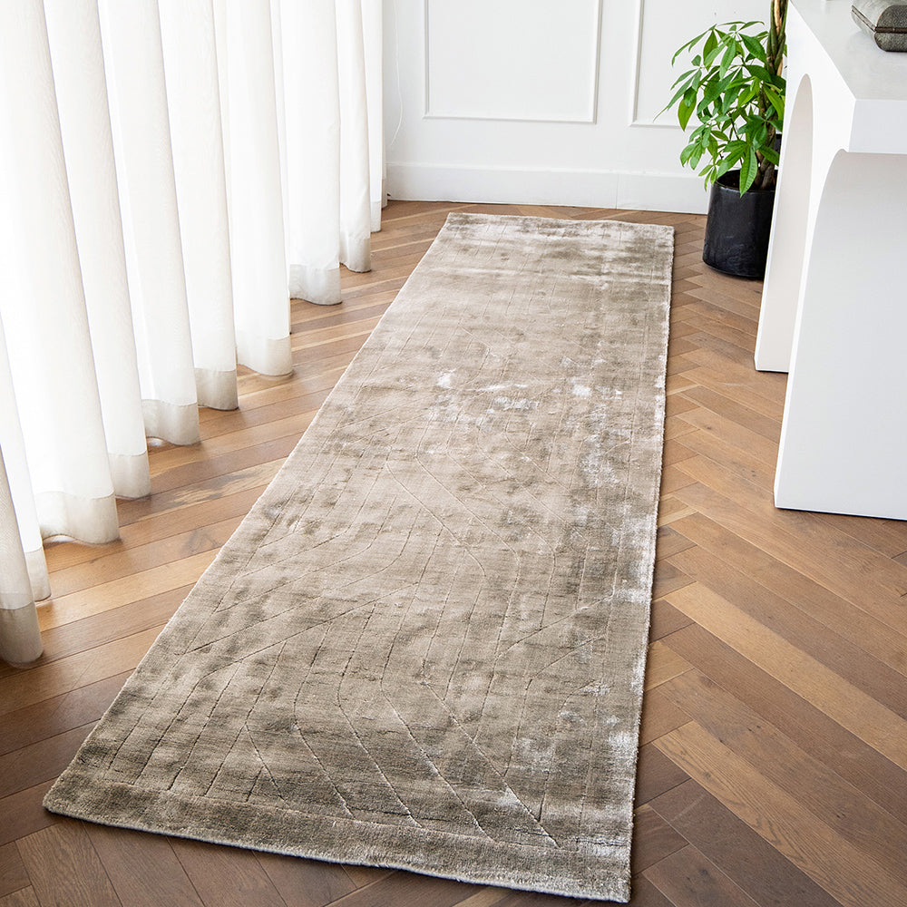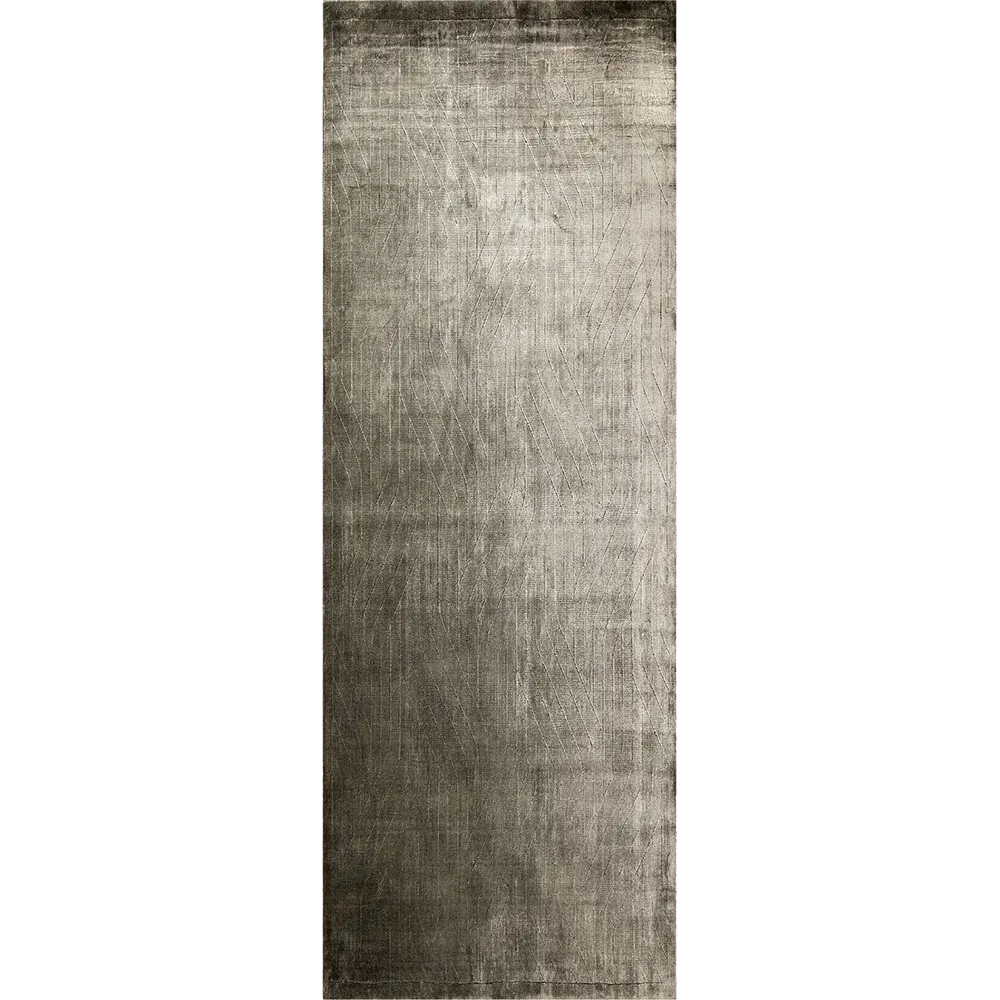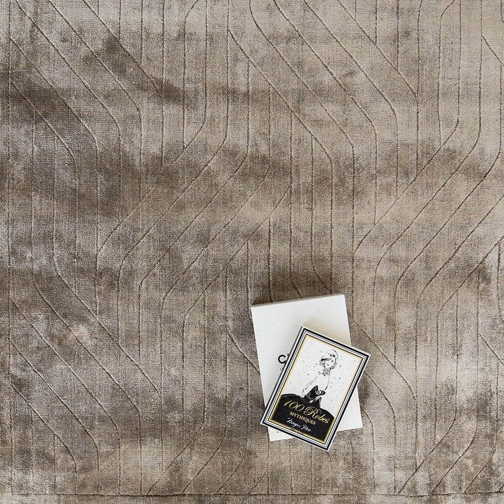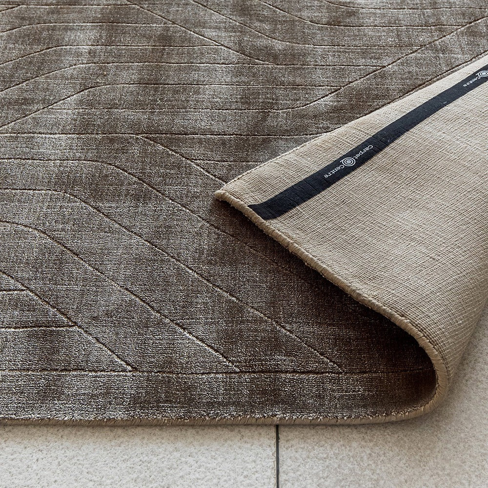 Блестящий, шелковистый и мягкий на ощупь ковер серо-коричневого цвета с резным узором в виде линий, придающим изделию изысканность.