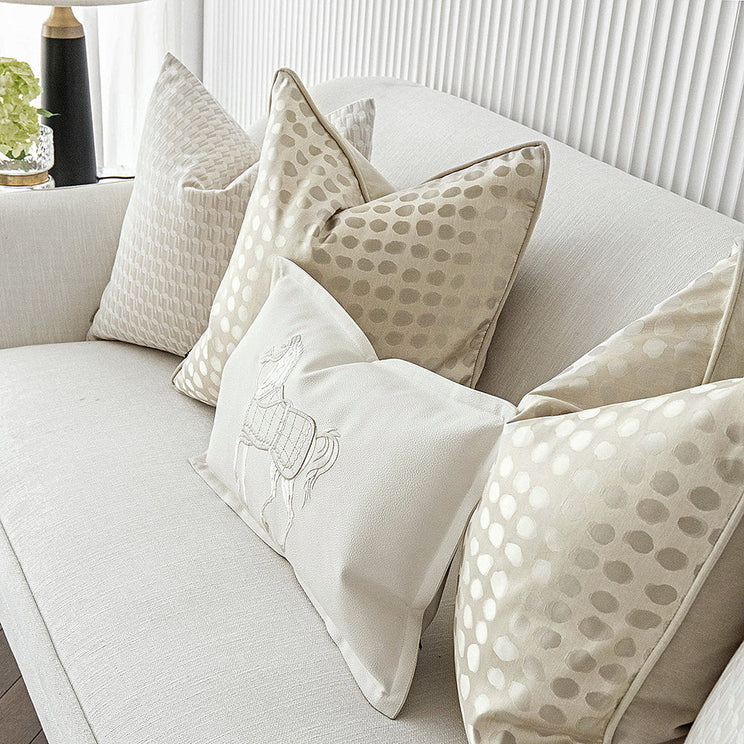 Дизайн: две подушки с золотым точечным узором, две серые подушки с объемным узором и декоративная подушка из полиуретана с изображением лошади.