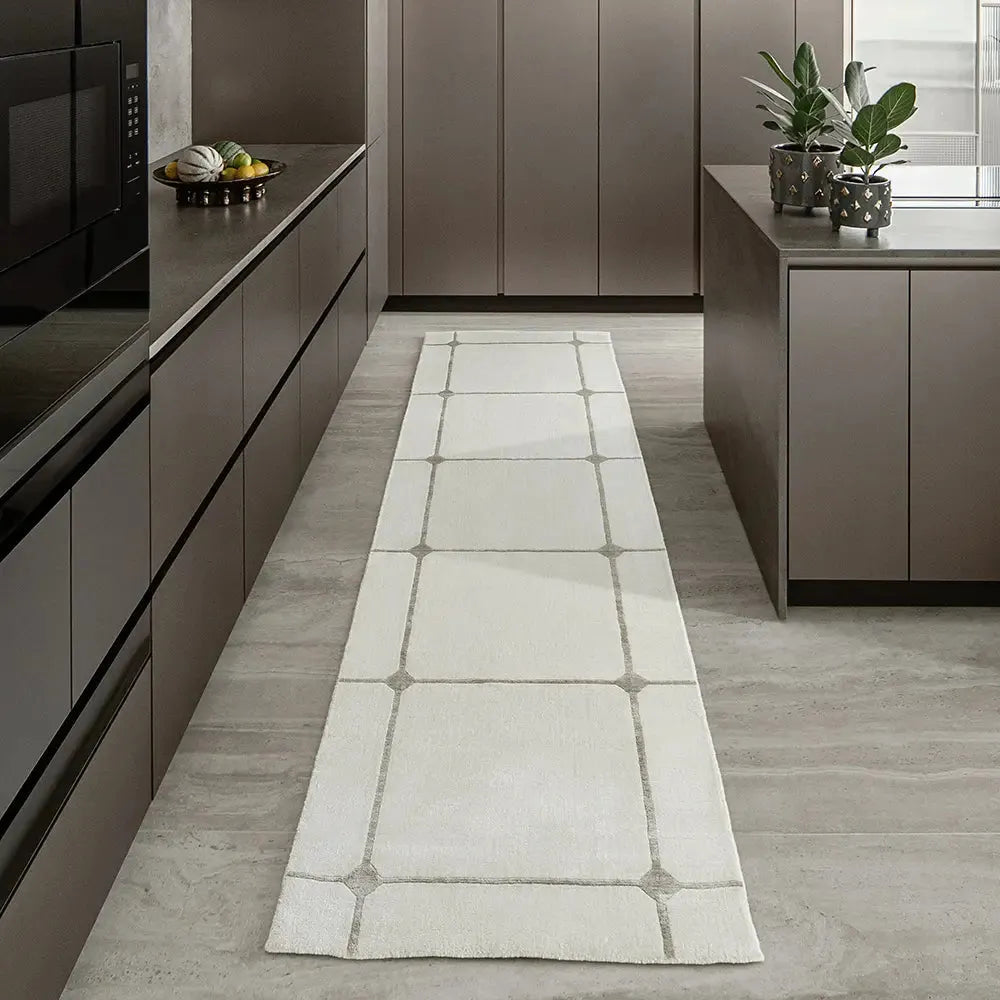 Этот кремовый ковер украшен крупным сетчатым узором, который прекрасно впишется в современный интерьер. Ковер, изготовленный из высококачественных материалов, имеет легкий блеск и придаст вашему дому ощущение роскоши.