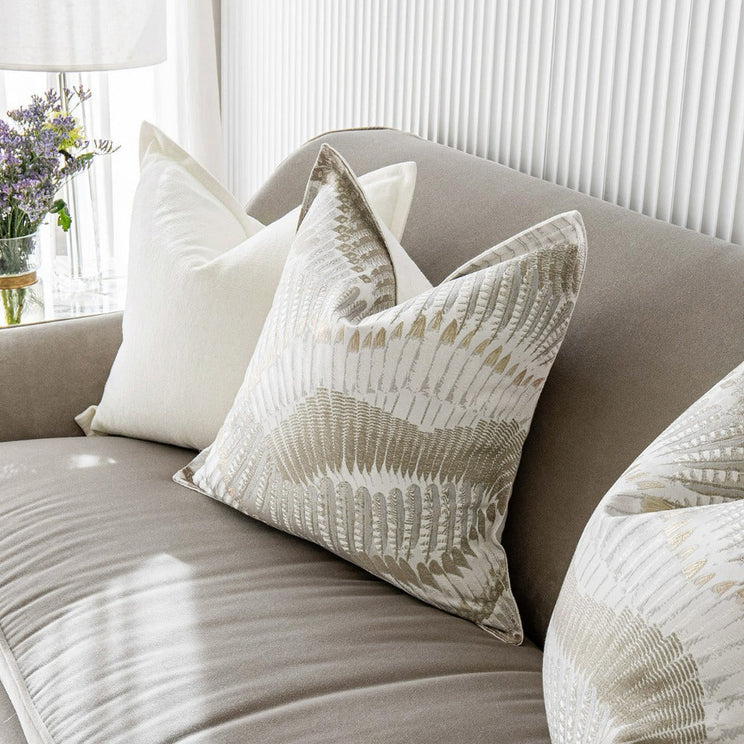 Этот комплект подушек привнесет ощущение воздушности в ваше жилое пространство. В комплект входят две белые хлопковые подушки и две подушки с узором из изящных перьев золотого и серебряного цвета спереди.