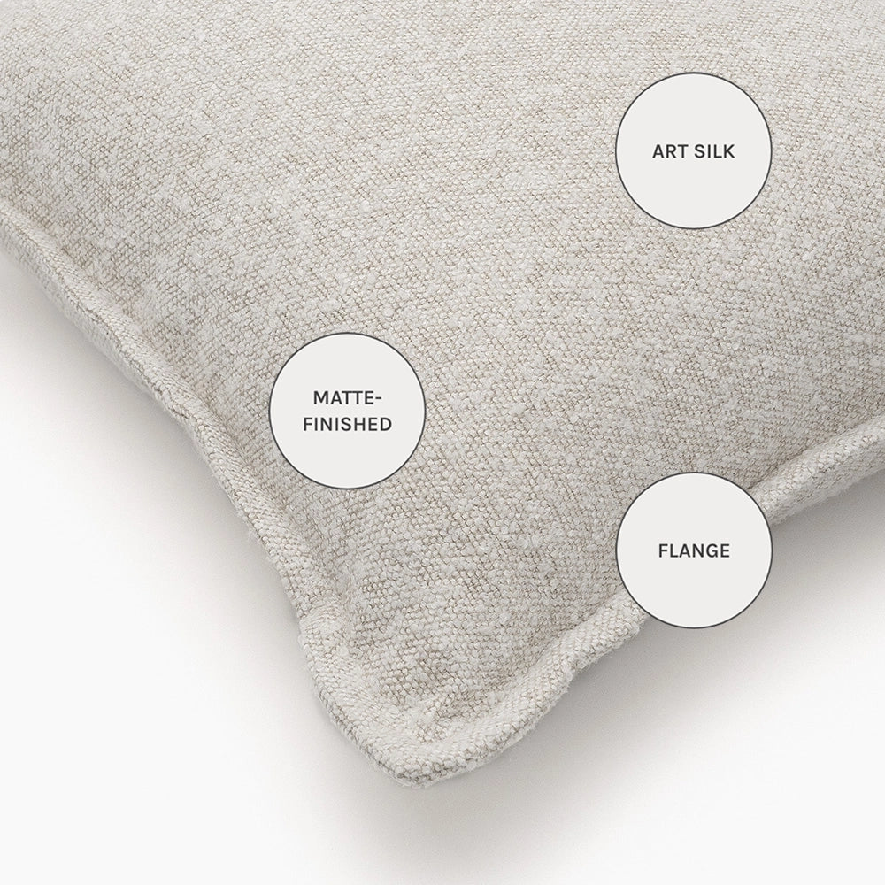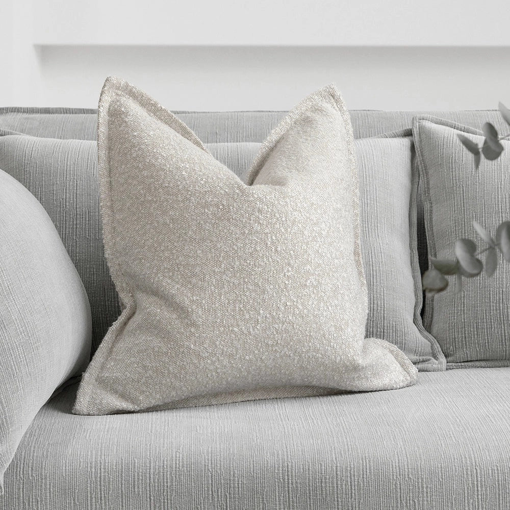 Дизайн: Отличается тонкой рельефной текстурой с неровными, пушистыми нитями, создающими ощущение ручной работы. Плетеная основа сочетает в себе кремовые и бежевые нити, создавая мягкий, естественный вид с ненавязчивой объемностью. Обратная сторона выполнена в соответствующем оттенке, что делает подушку гармоничной и позволяет легко сочетать ее с другими элементами декора.