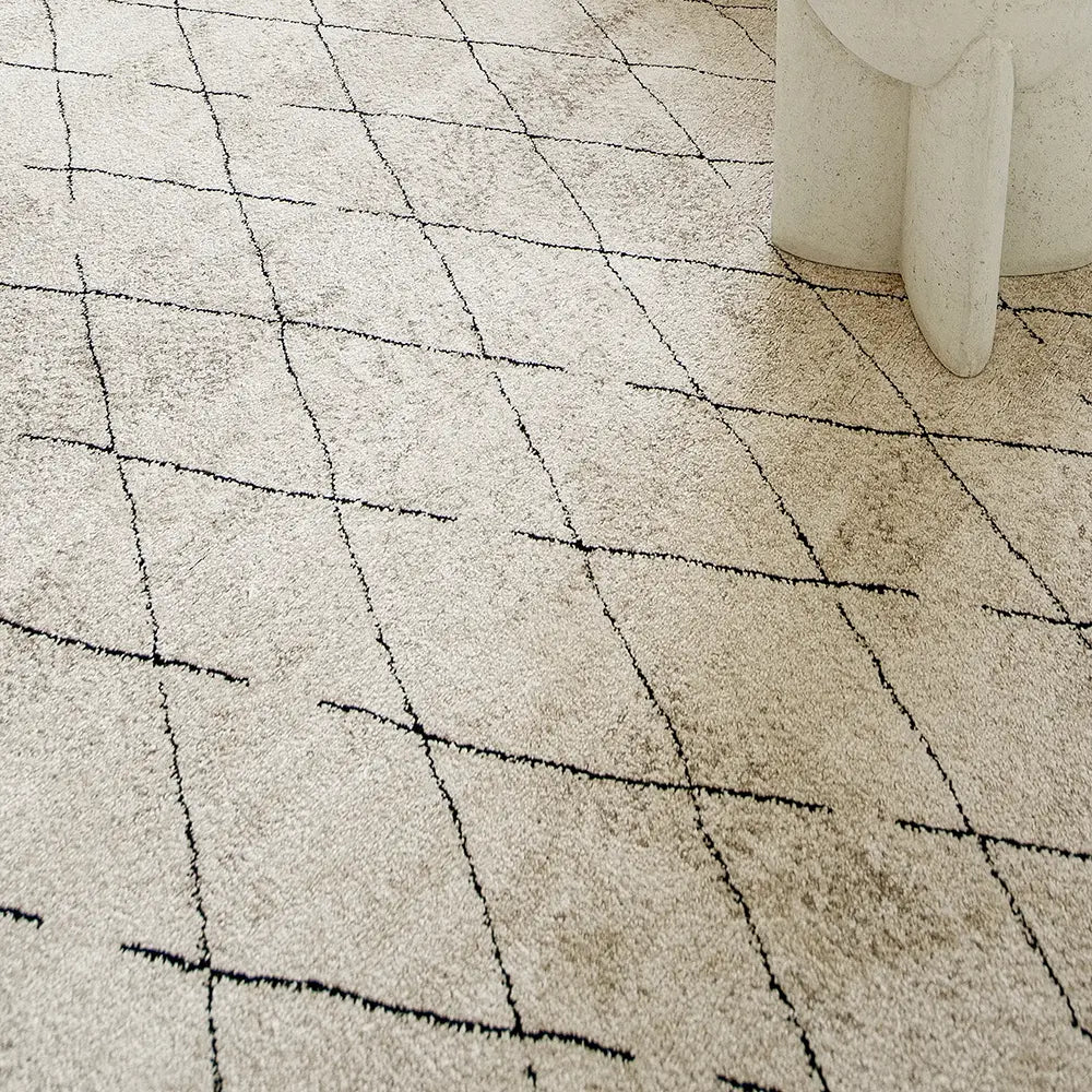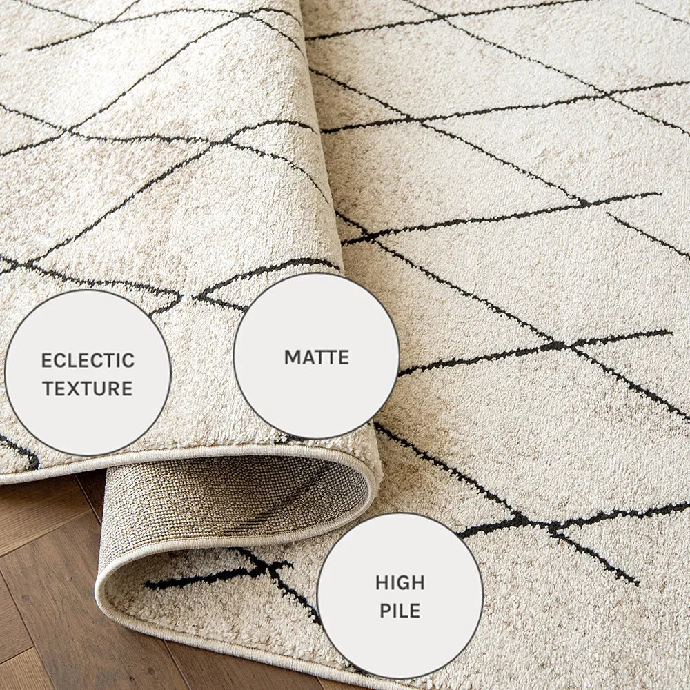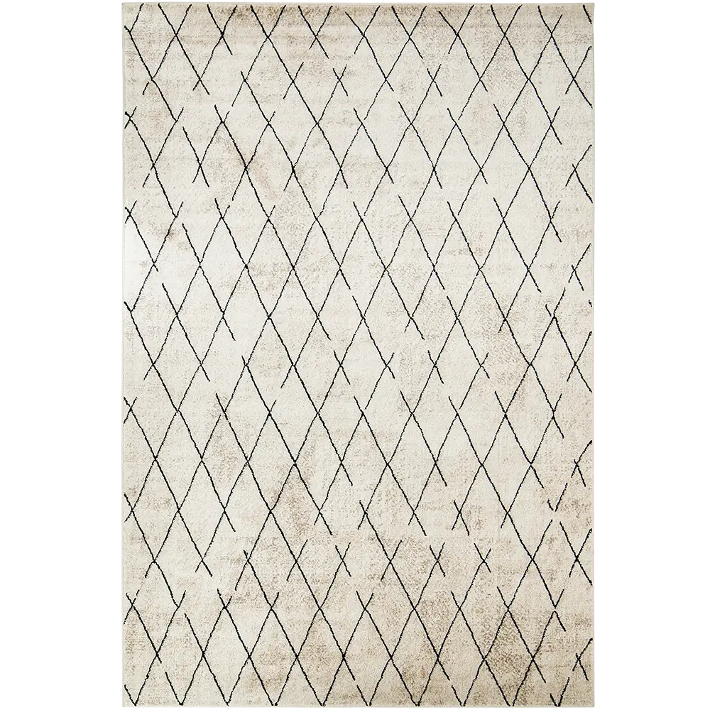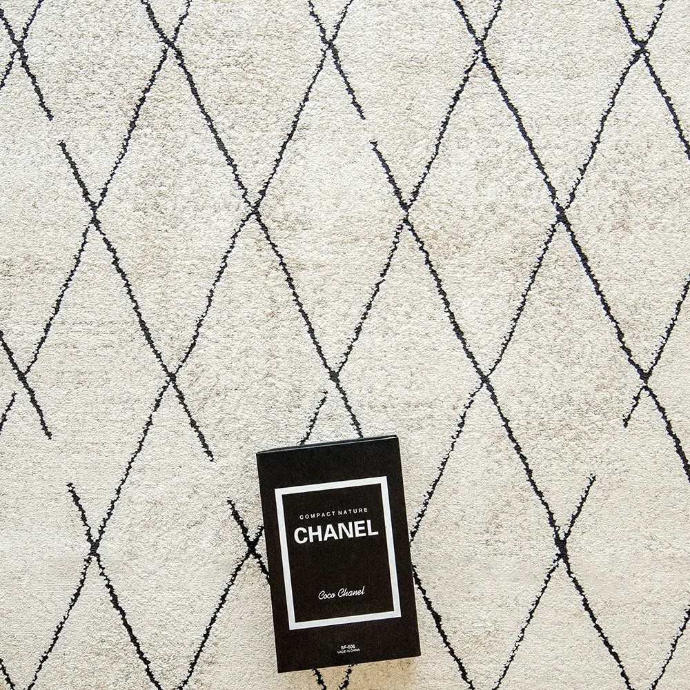 Этот черно-бежевый ковер в берберском стиле сочетает в себе геометрические ромбовидные формы и уютные текстуры, создавая стильный эффект.