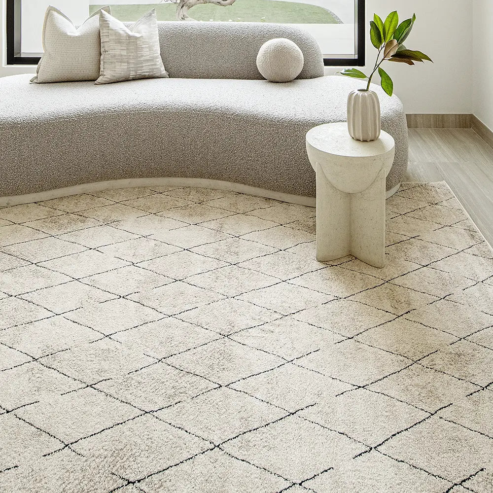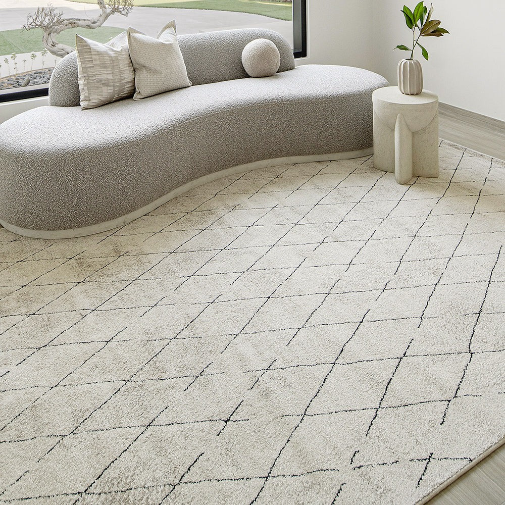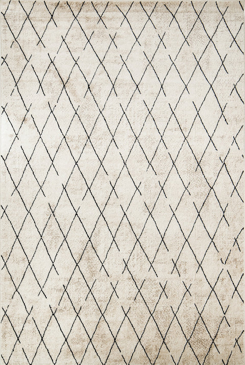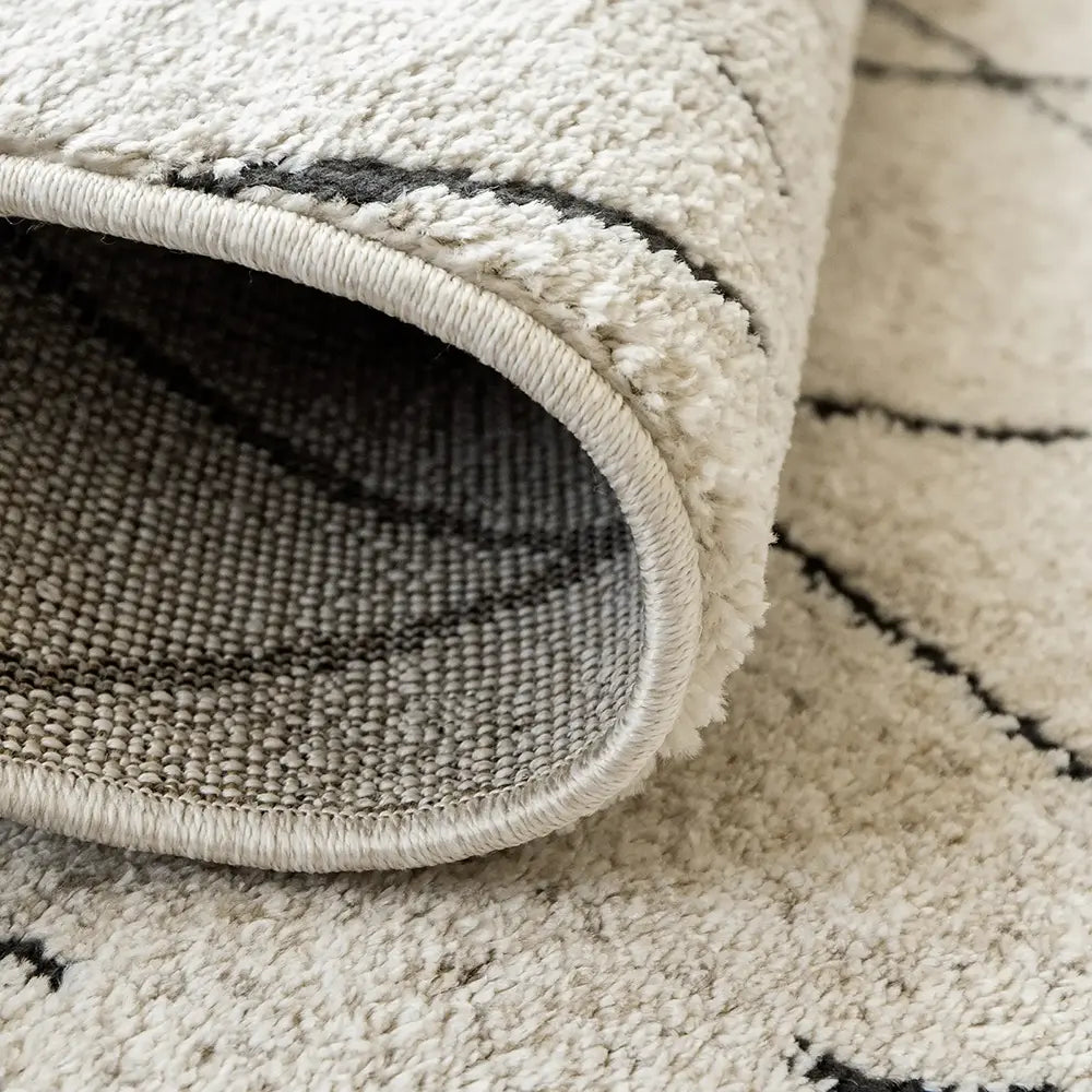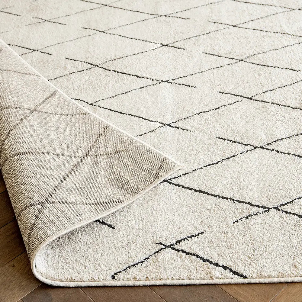 Этот черно-бежевый ковер в берберском стиле сочетает в себе геометрические ромбовидные формы и уютные текстуры, создавая стильный эффект.