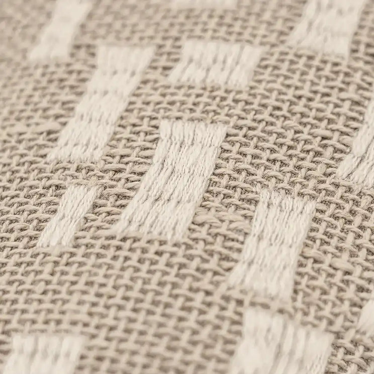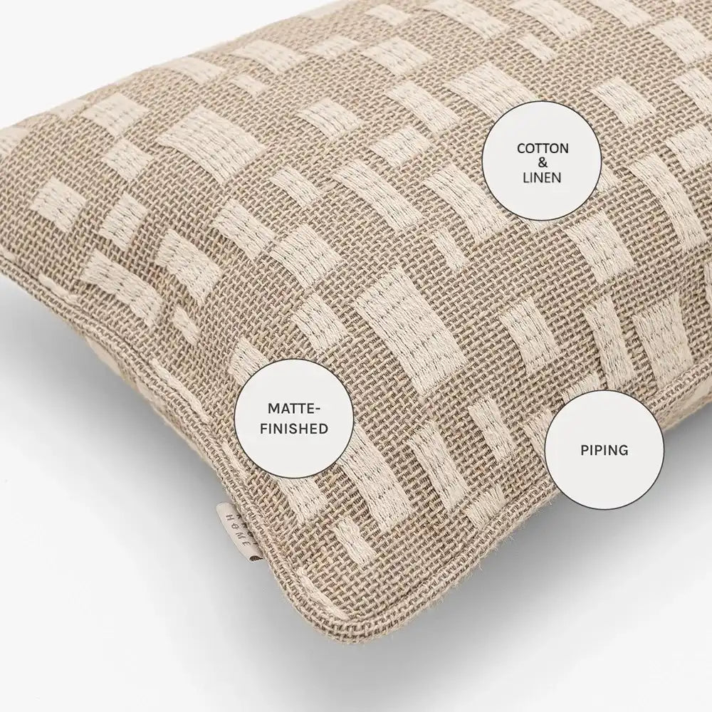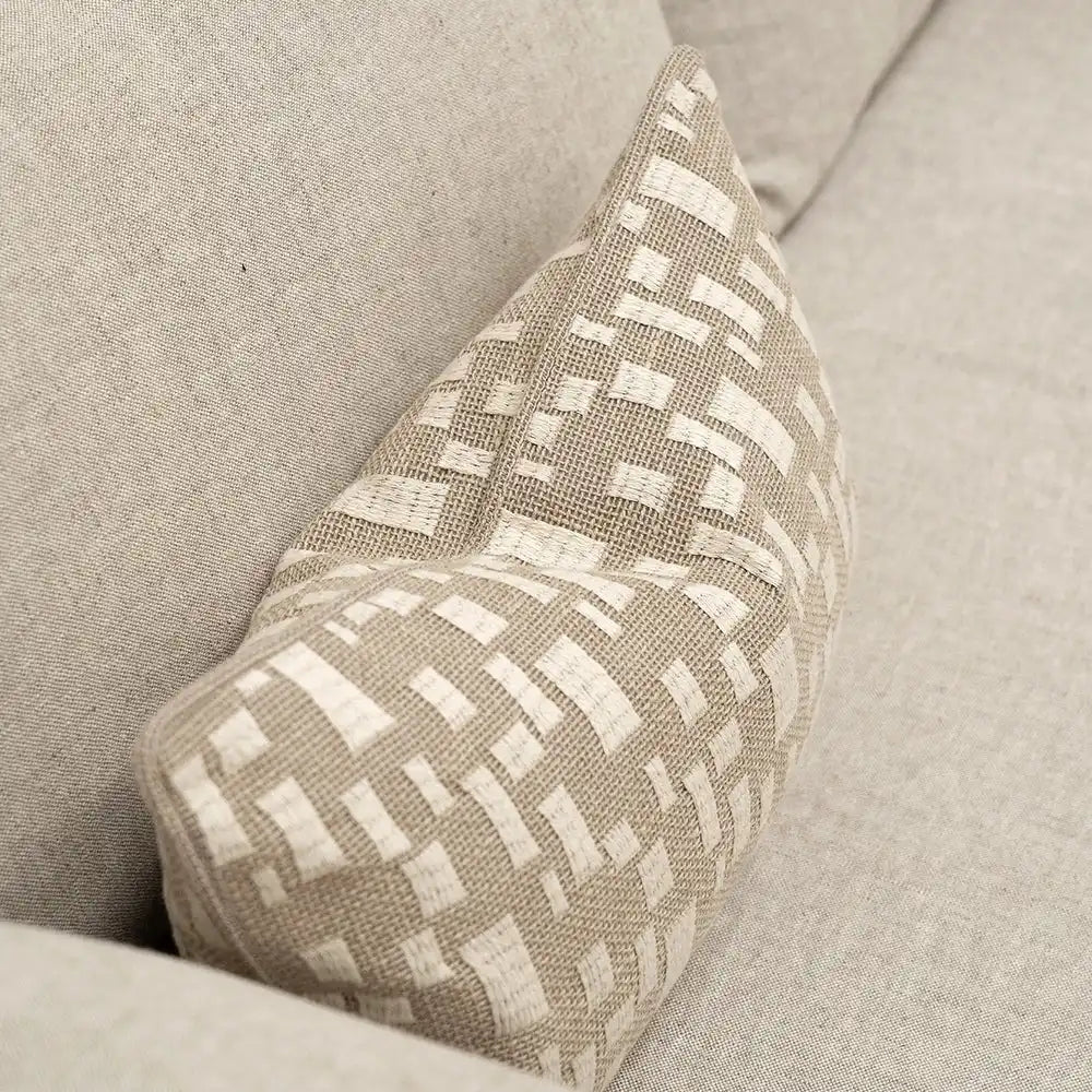 Эта бежевая подушка с рисунком из фактурных прямоугольников, плавно перетекающих друг в друга, создаёт успокаивающее ощущение. Эта подушка нейтрального оттенка, изготовленная из хлопка и льна, придаст любому дивану атмосферу дзен.