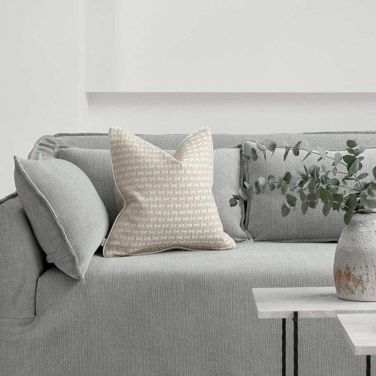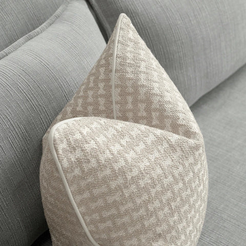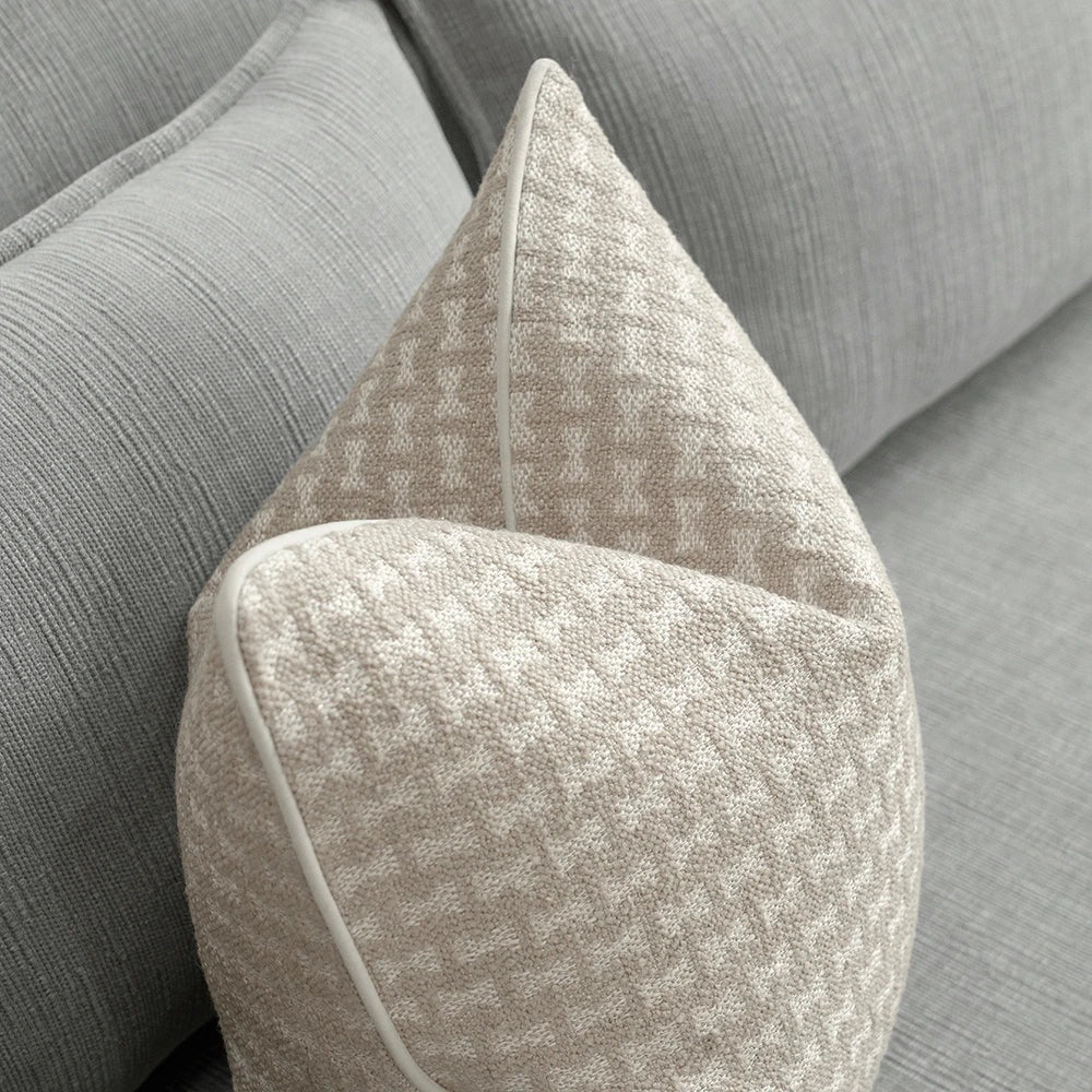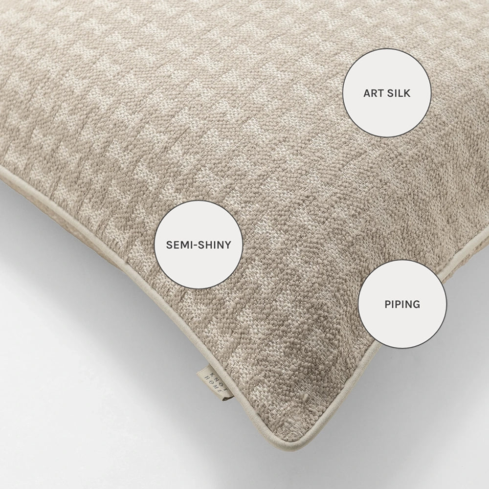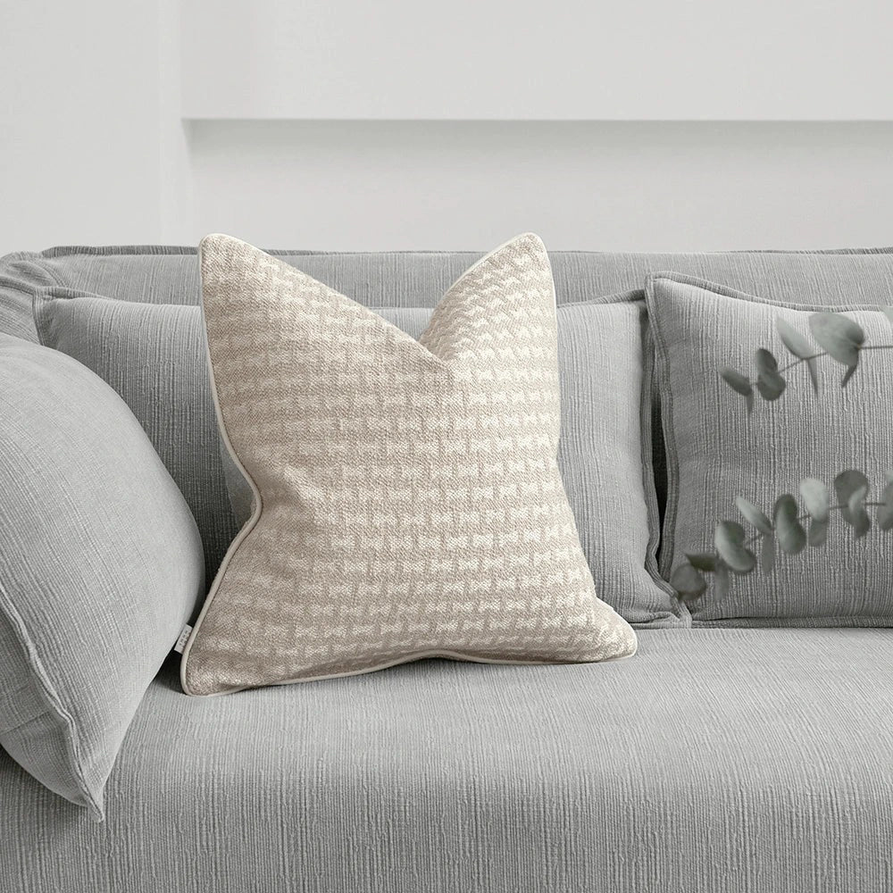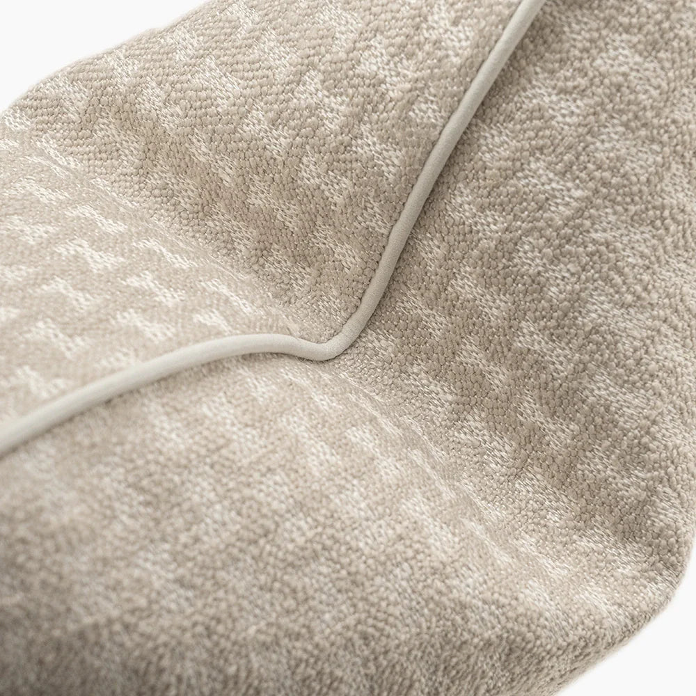 Мягкая, фактурная подушка спокойного нейтрального оттенка, сотканная с изысканным узором «гусиная лапка», который придает глубину, не создавая ощущения перегруженности. На ощупь она приятна на ощупь и элегантна, идеально подходит для многослойной укладки.