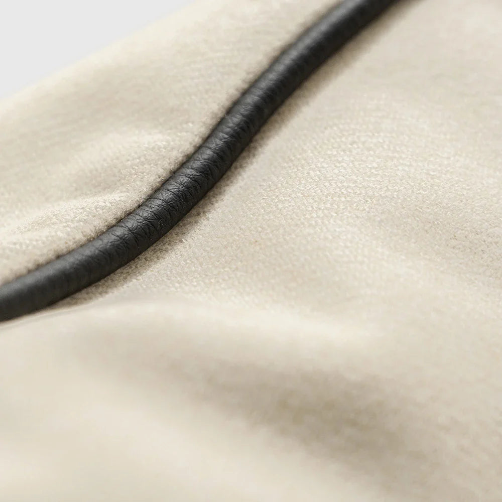 Дизайн: Чистая, не имеющая рисунка текстура мериносовой шерсти, обрамленная тонкой окантовкой из угольно-серой искусственной кожи, придает подушке четкий, аккуратный контур, сохраняя при этом спокойный и изысканный вид.