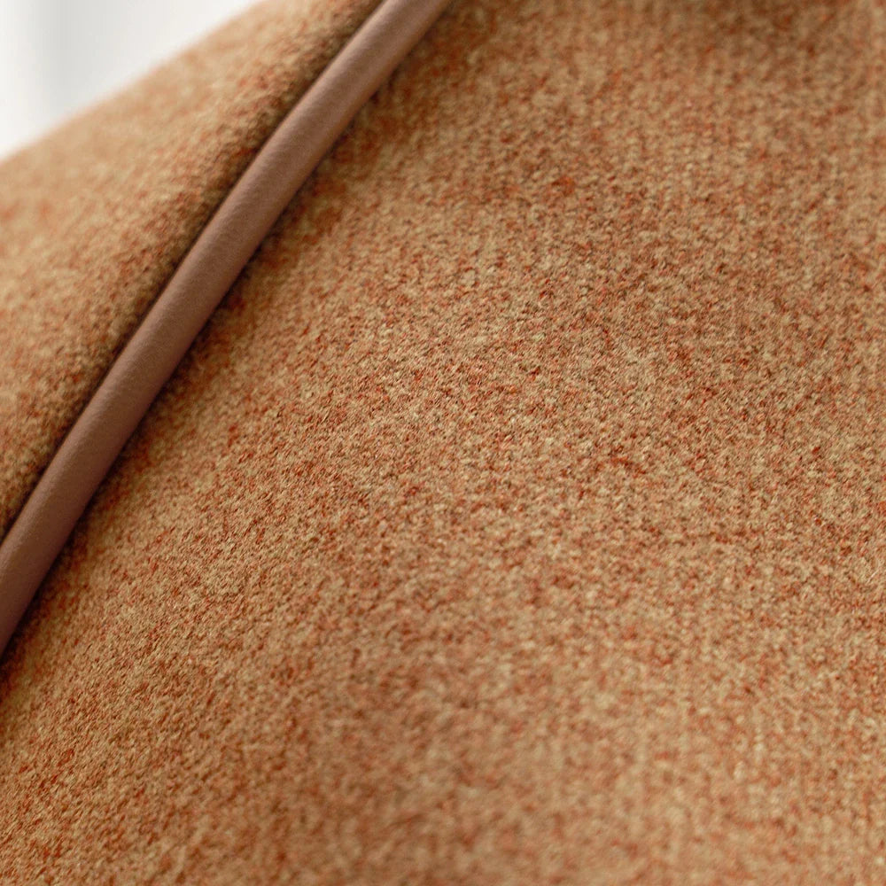 Дизайн: Гладкая, плотно сплетенная смесь мериносовой шерсти насыщенного ржаво-коричневого оттенка, отделанная тонкой окантовкой из искусственной кожи, придающей изящный, элегантный силуэт.