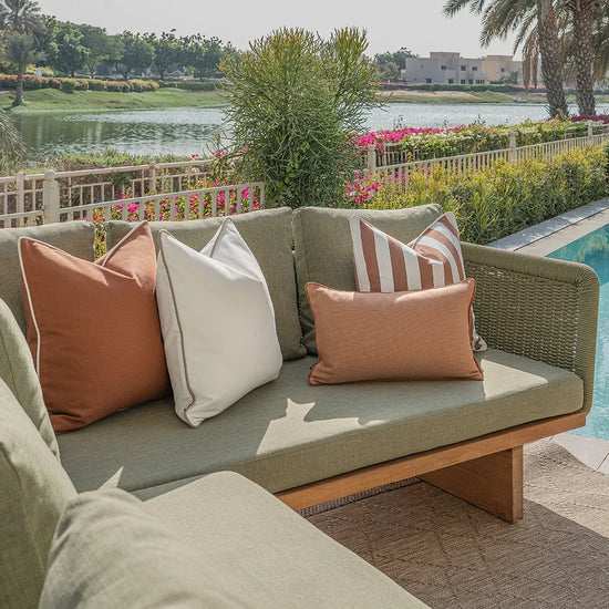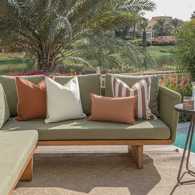 В этом наборе уличных подушек тёплые, землистые цвета сочетаются с яркими, современными полосками. Этот комплект подушек цвета слоновой кости и ржавчины, мастерски сочетающий однотонные и полосатые подушки, преобразит любое патио.