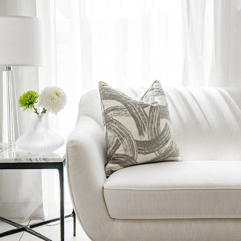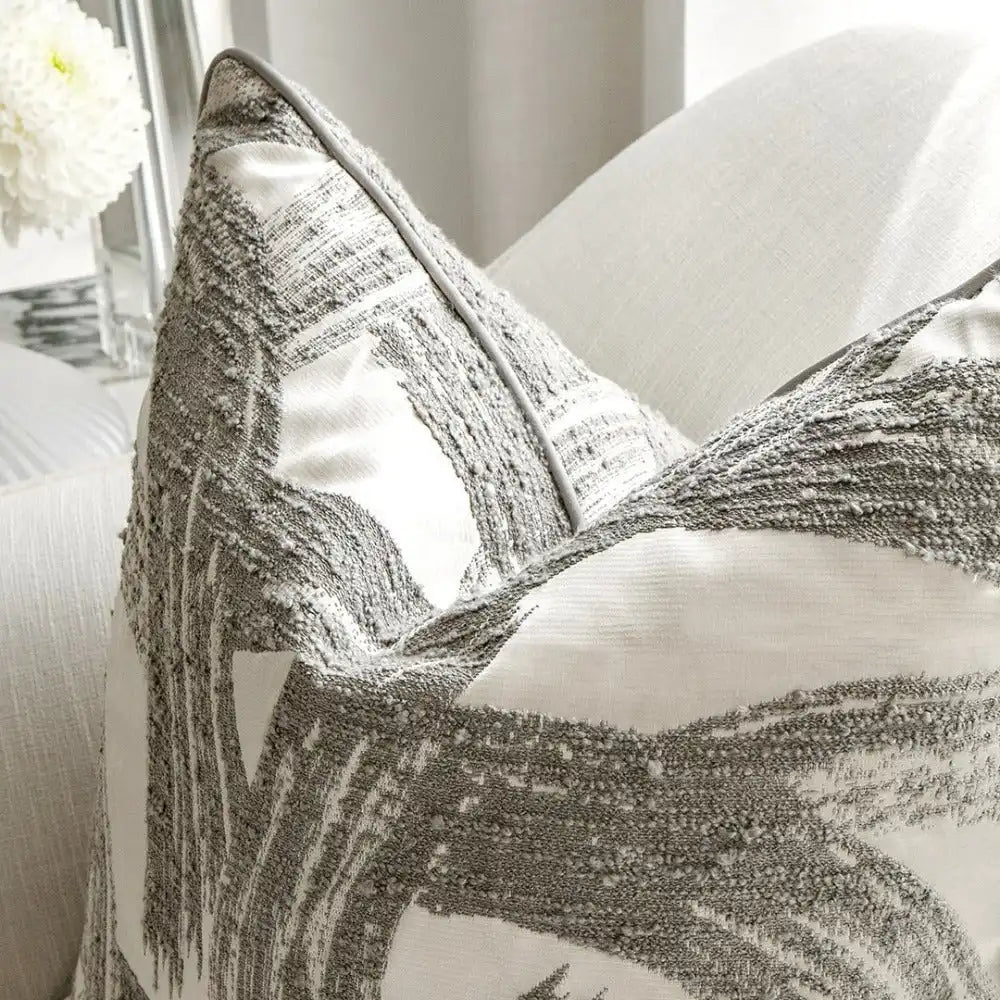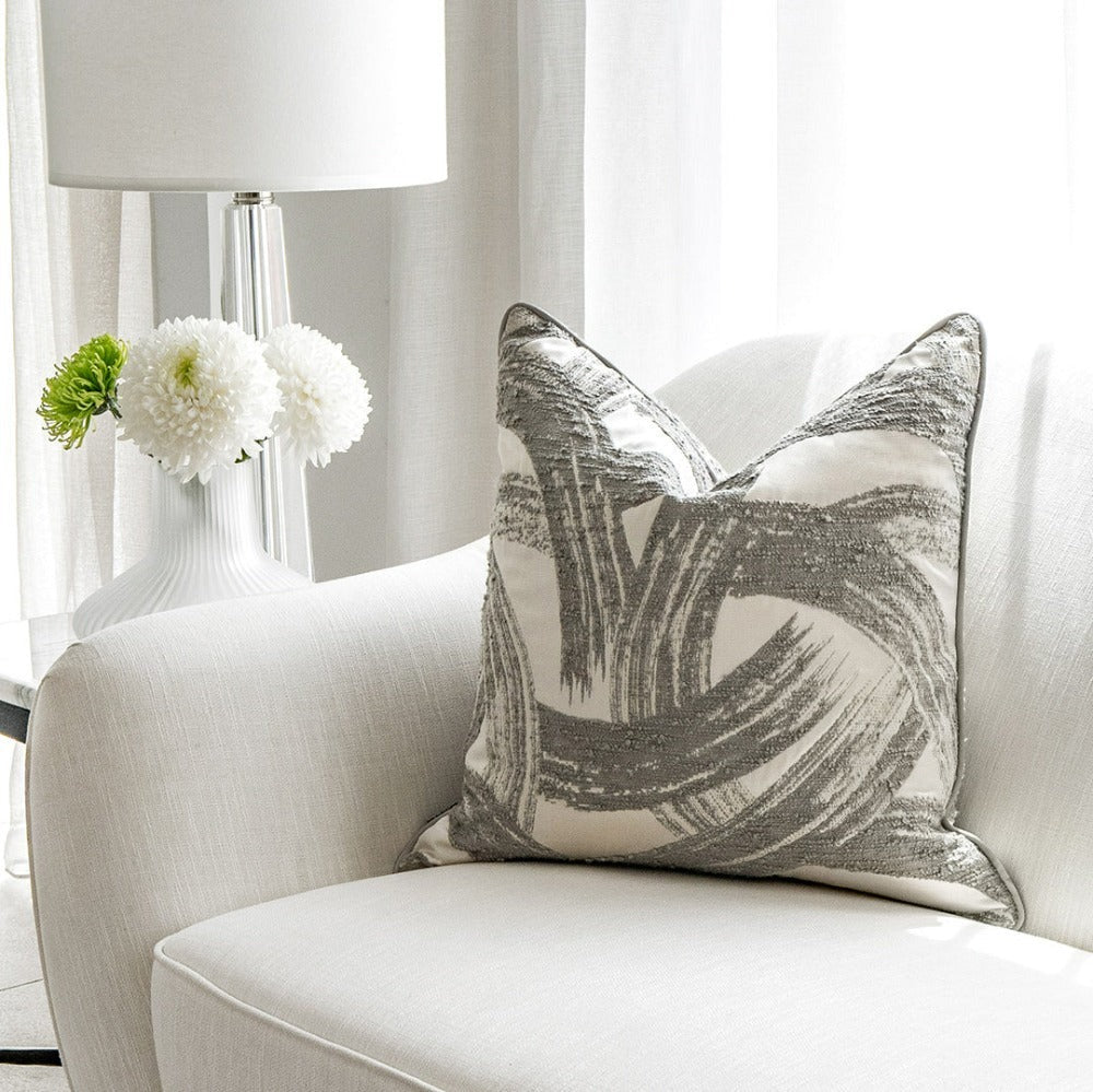 Эта подушка с завитковым узором привнесет ощущение роскоши в вашу гостиную. Серо-белая подушка украшена крупным мазком, а сочетание текстур добавляет еще больше интереса.