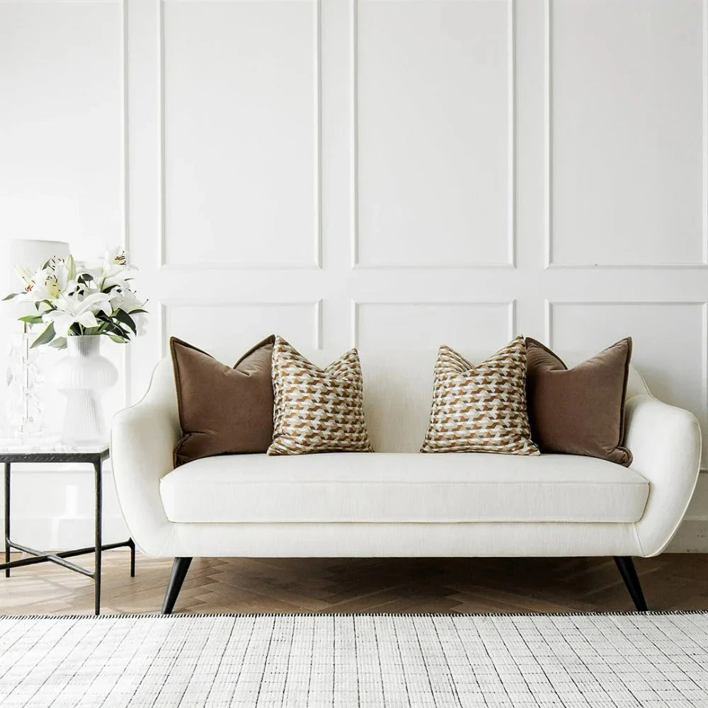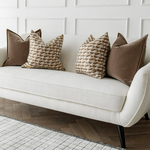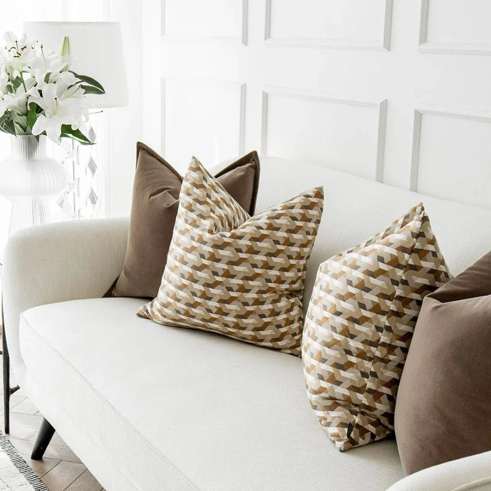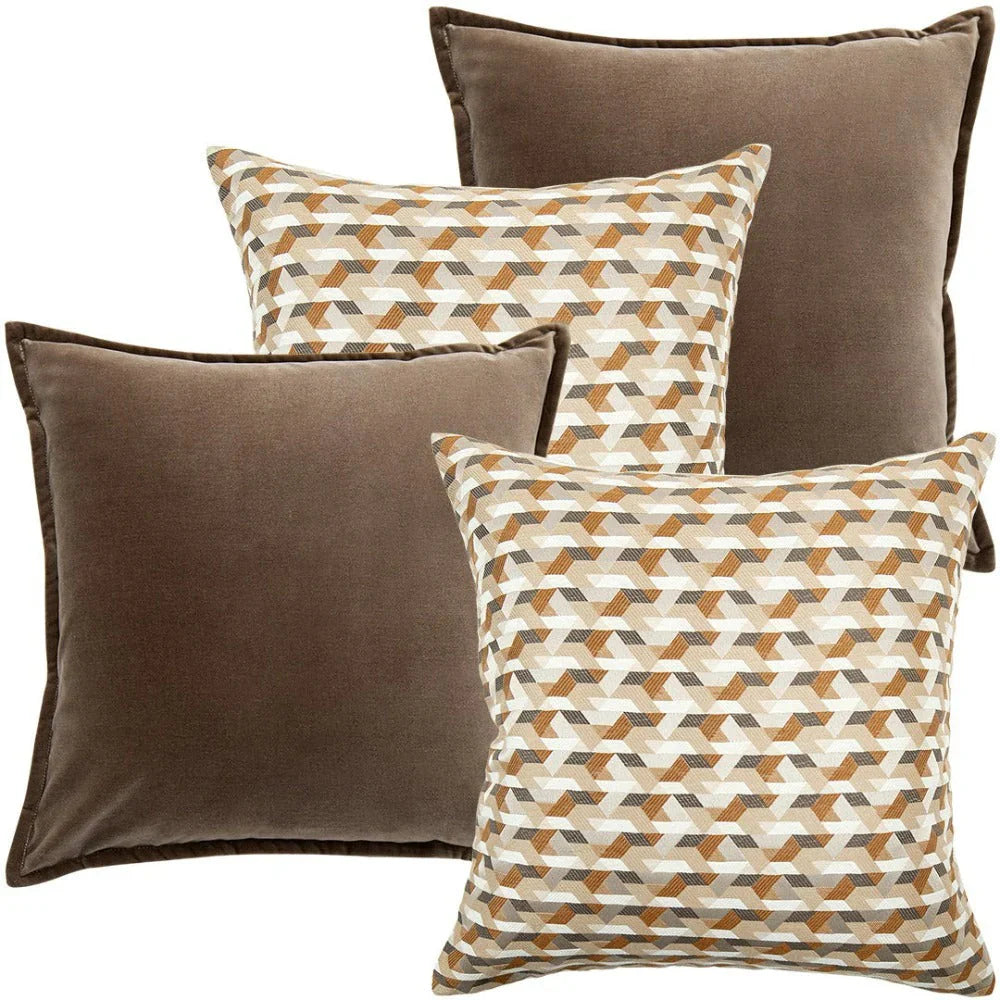 Дизайн: две коричневые бархатные подушки и две коричнево-белые подушки с узором в стиле оп-арт.
