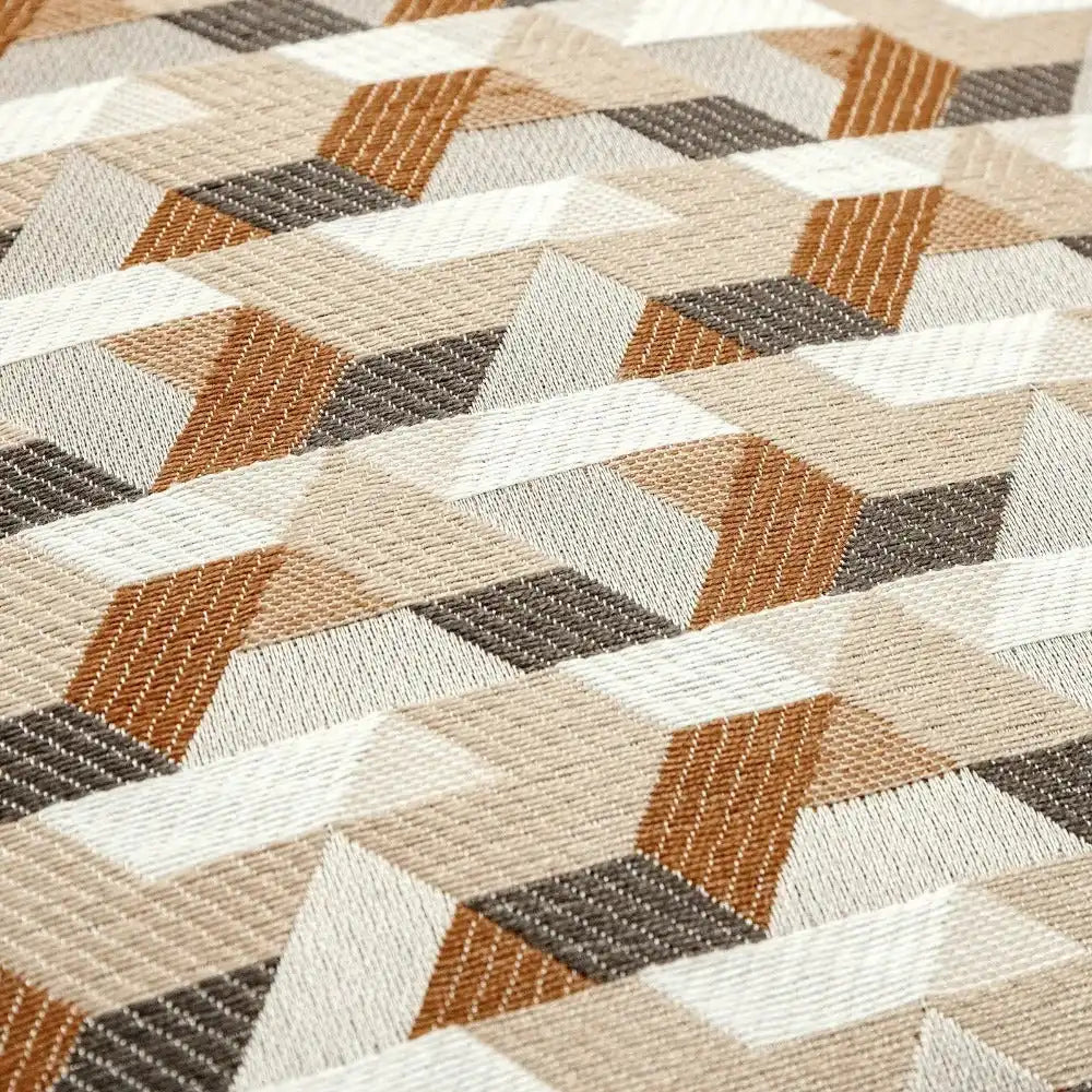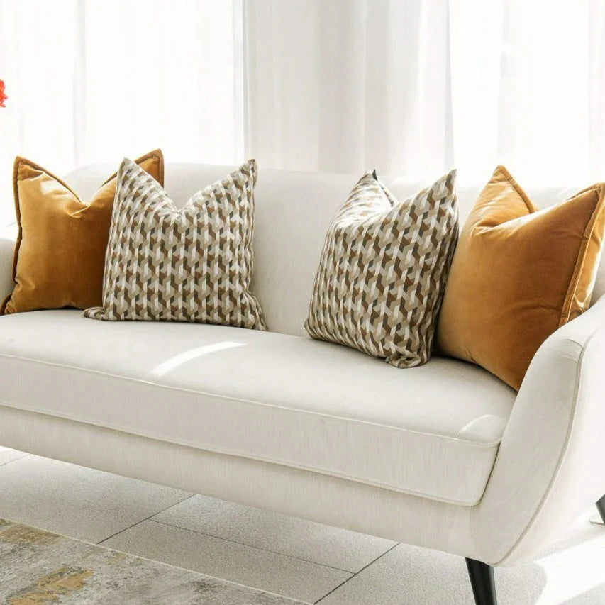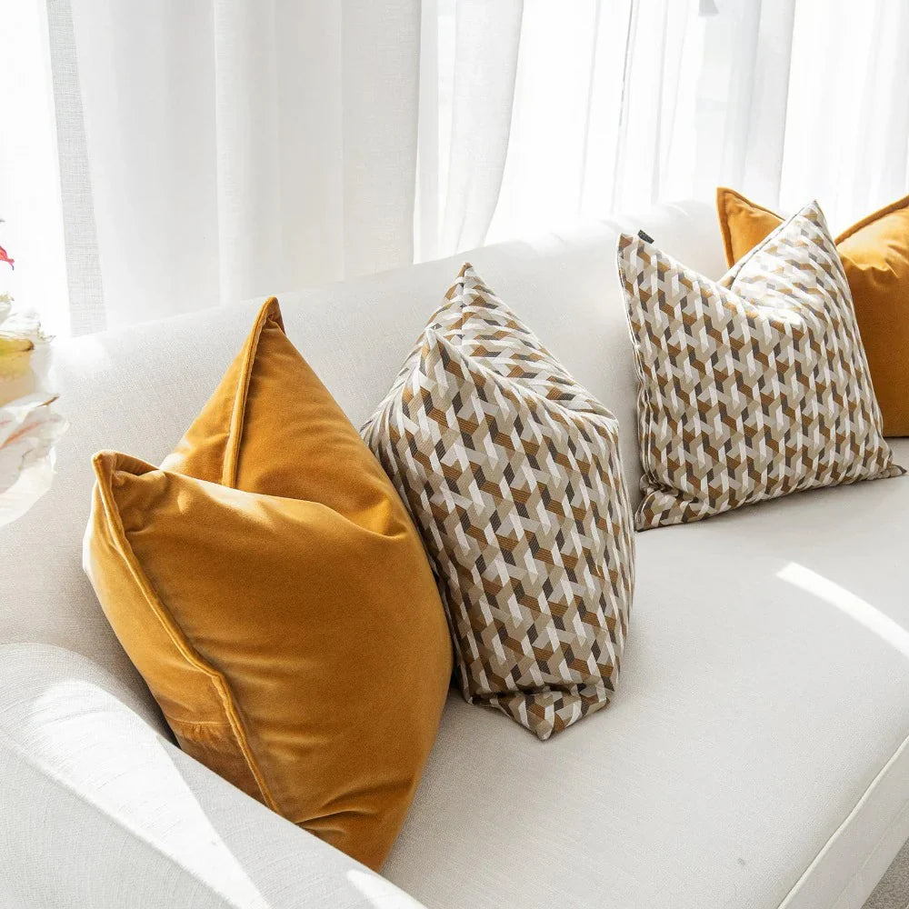 Дизайн: две оранжевые бархатные подушки и две коричнево-белые подушки с трехмерным узором.