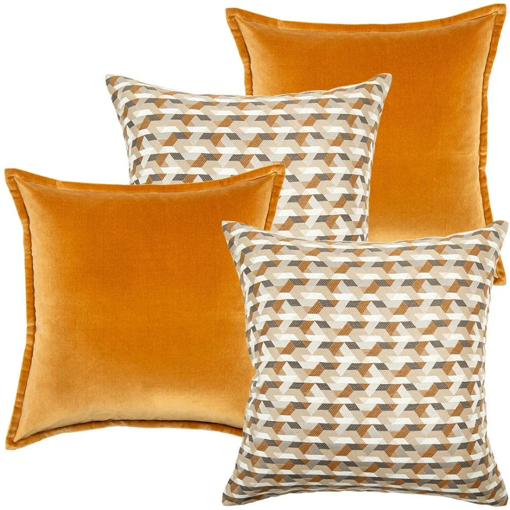 Посмотрите, как ваша гостиная оживет с помощью этого яркого комплекта подушек. В комплект входят две бархатные подушки теплого оранжевого цвета и две подушки с трехмерным рисунком, демонстрирующим потрясающий геометрический дизайн.