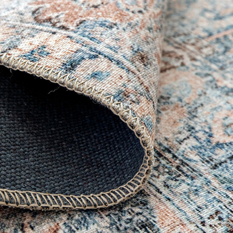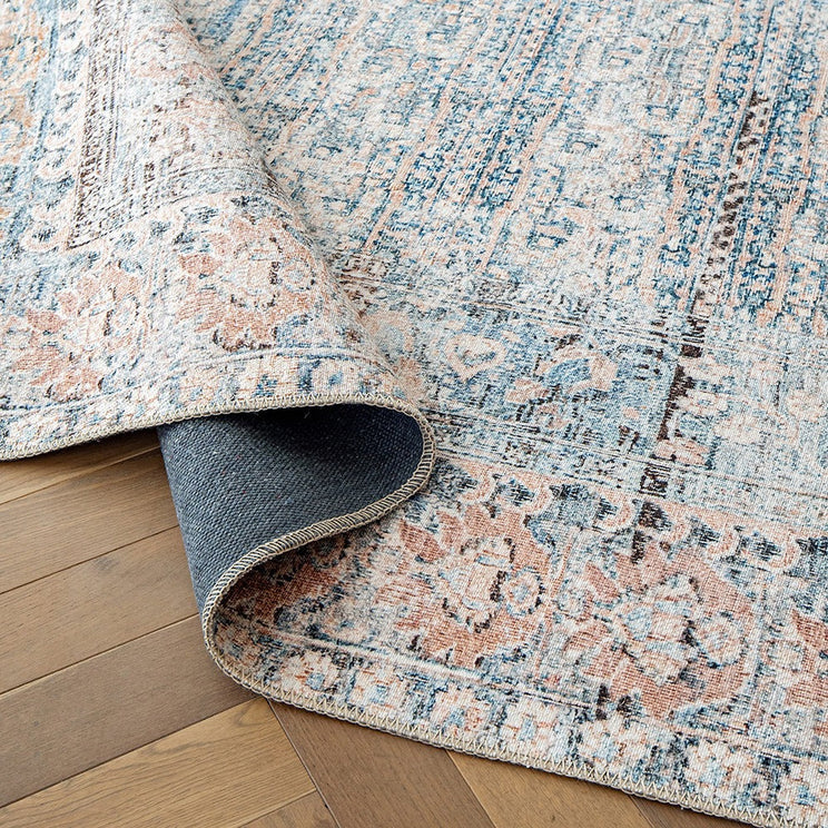 Ржавые и синие оттенки этого узорчатого ковра местами поблекли, создав нежный оттенок цвета.