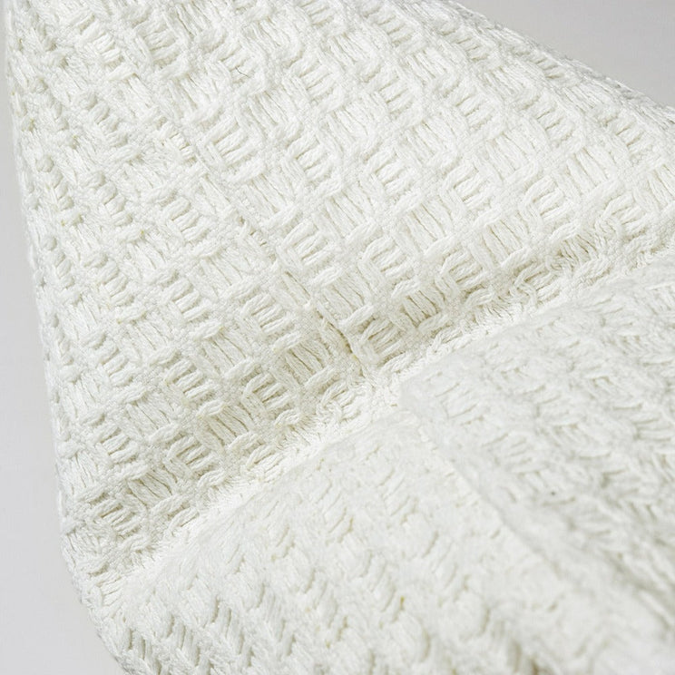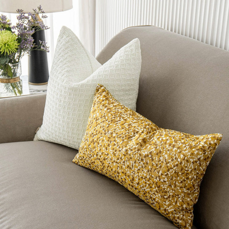Дизайн: две белые жаккардовые подушки и акцентная подушка с золотисто-желтым пиксельным узором.