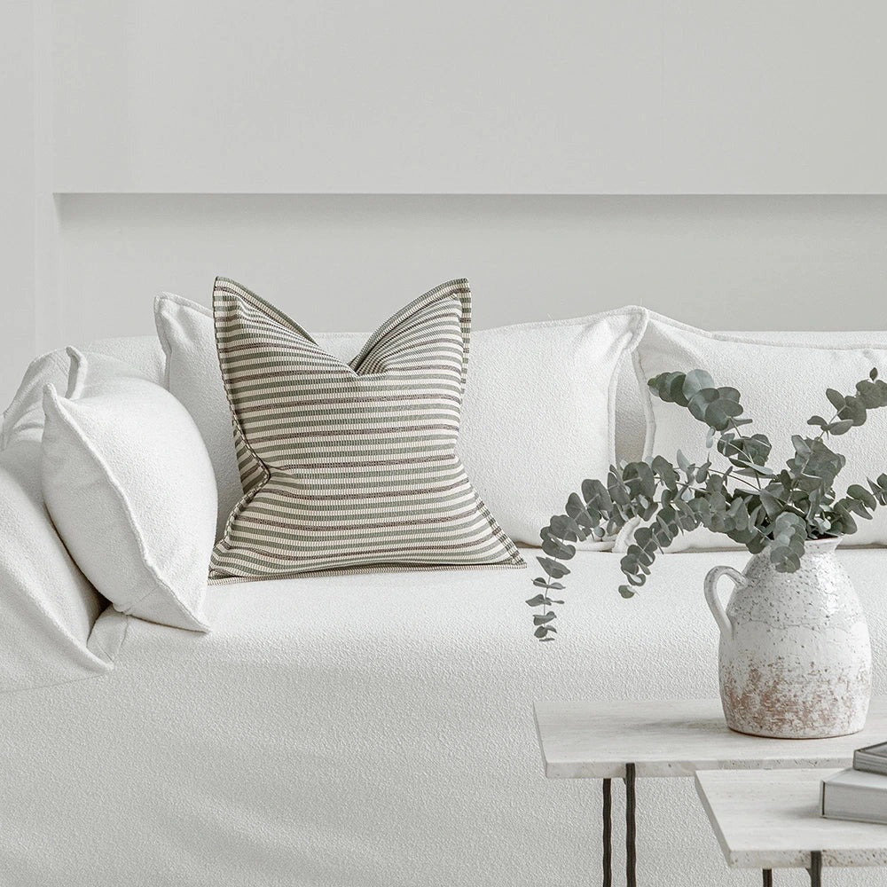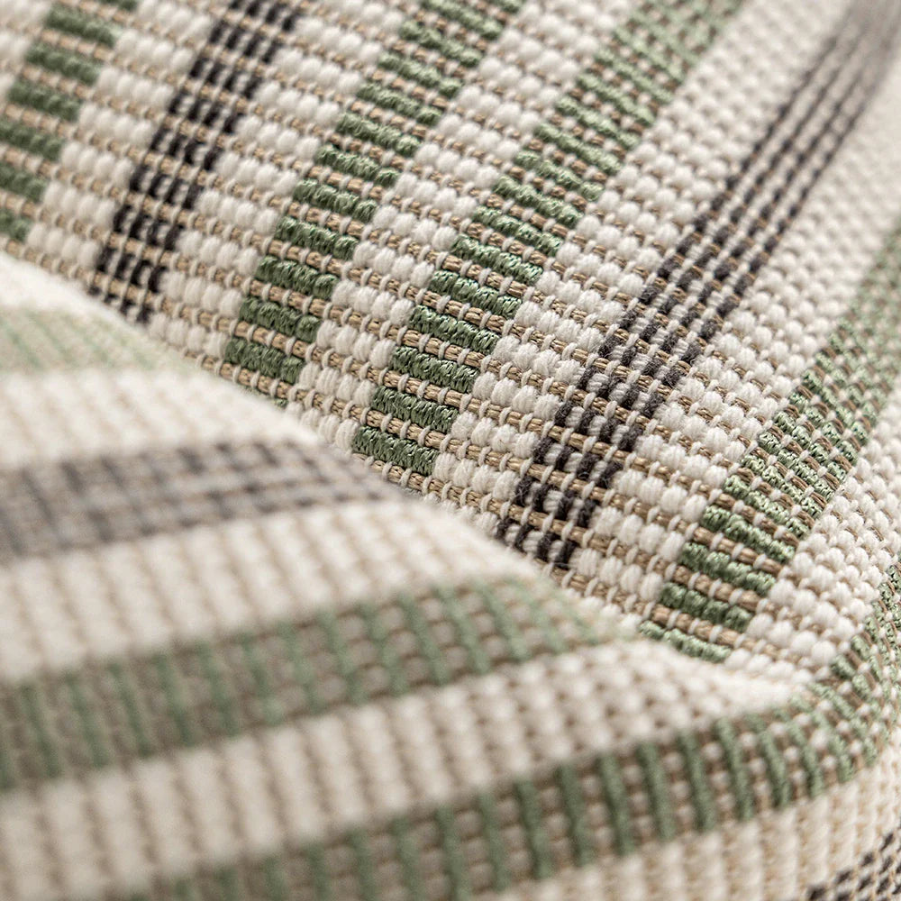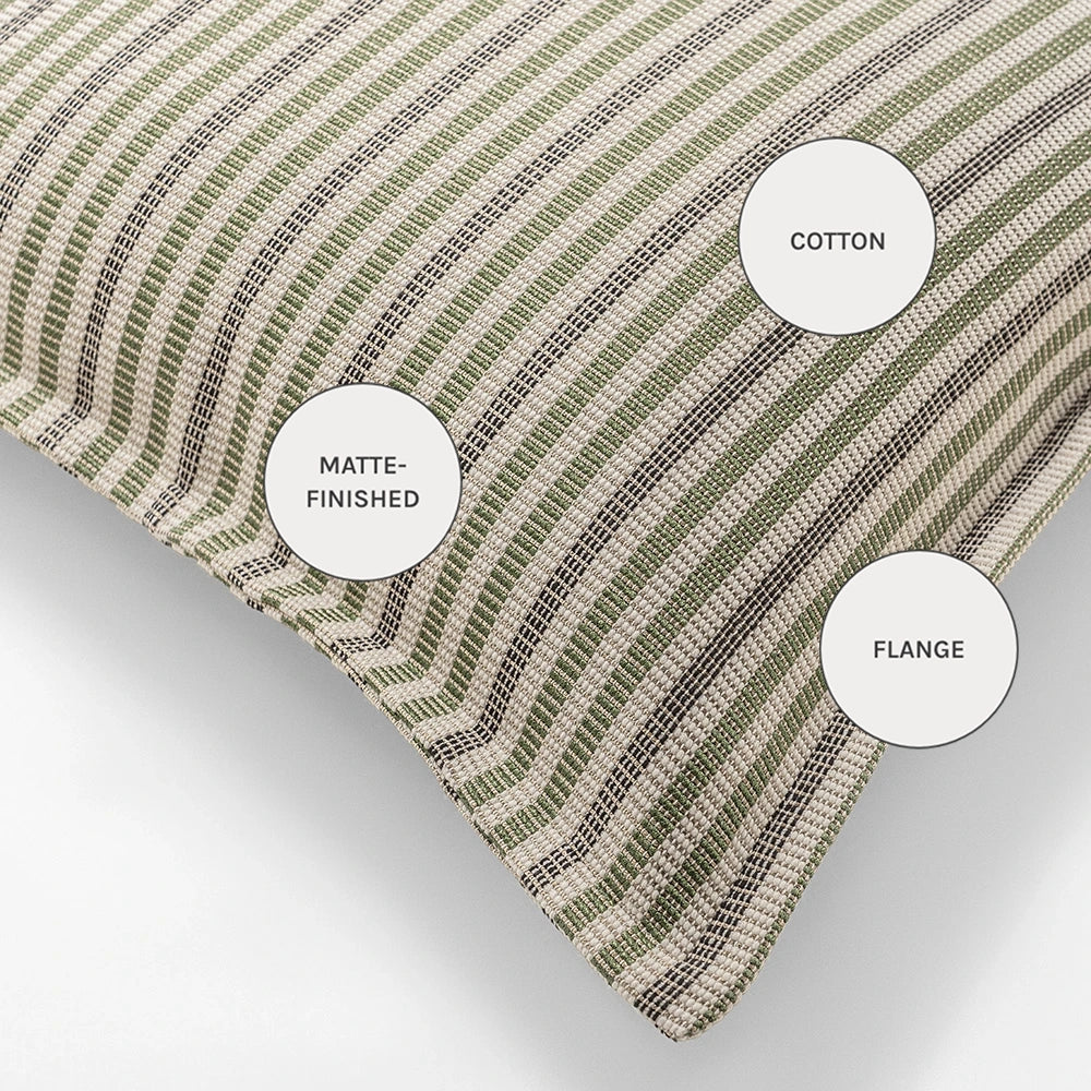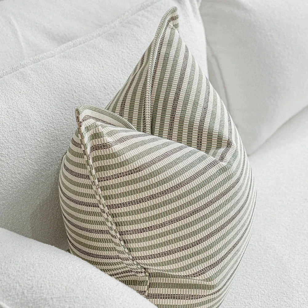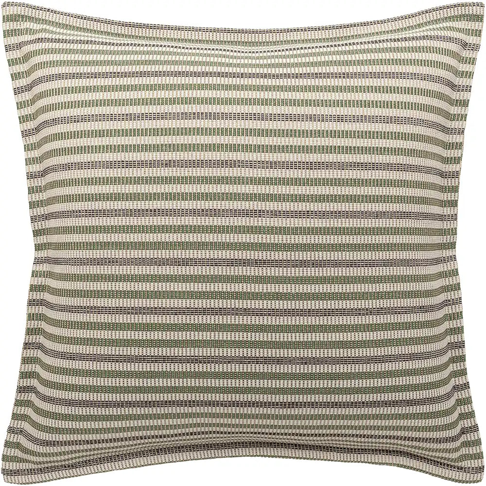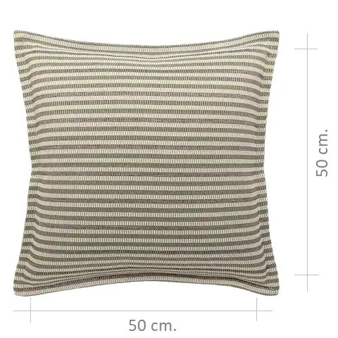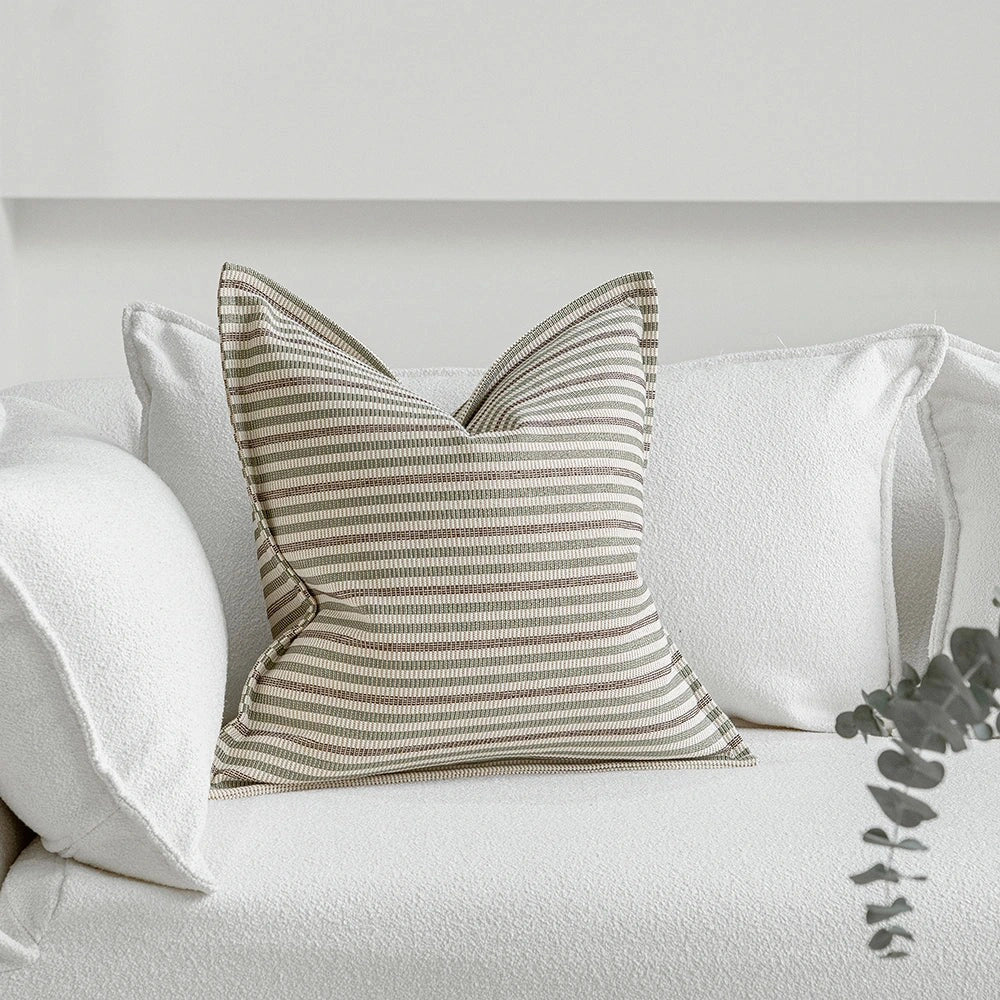 Изящная подушка, сотканная из тонких горизонтальных полос, сочетает в себе мягкие натуральные тона с легким блеском. Текстура одновременно приятная и уютная, создающая ощущение изысканности и современности.