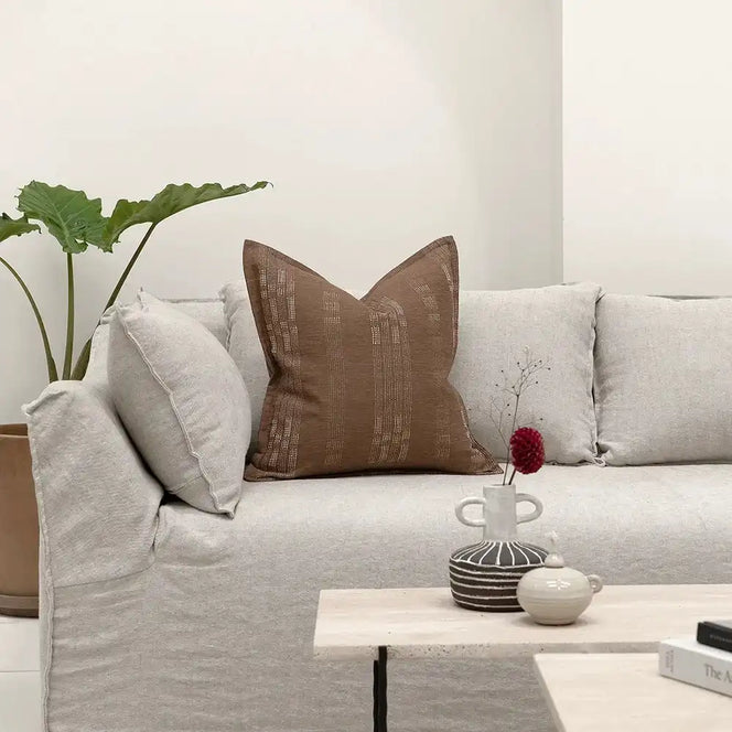 Теплые цвета сочетаются с натуральными волокнами в этой узкой полосатой подушке. Эта коричневая подушка украшена полосками из пунктирных линий по всей длине, которые станут ярким дополнением к интерьеру вашей гостиной.