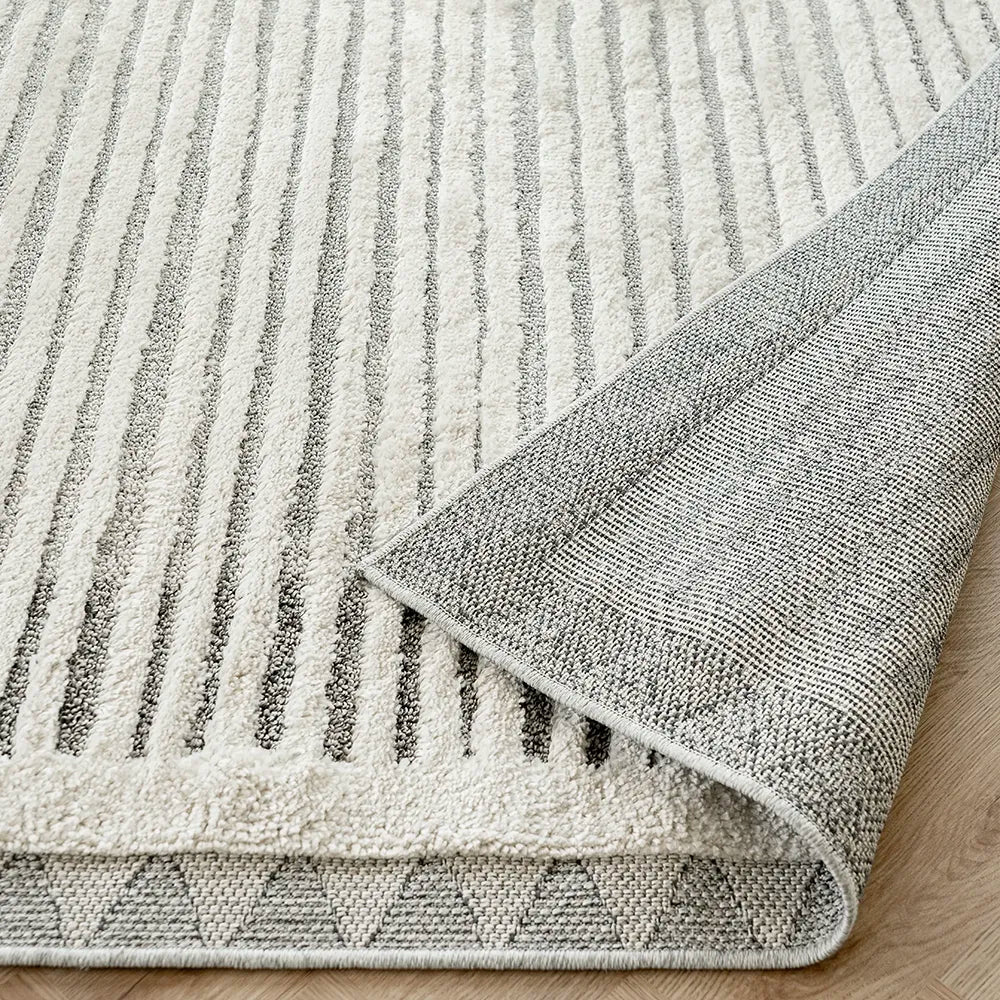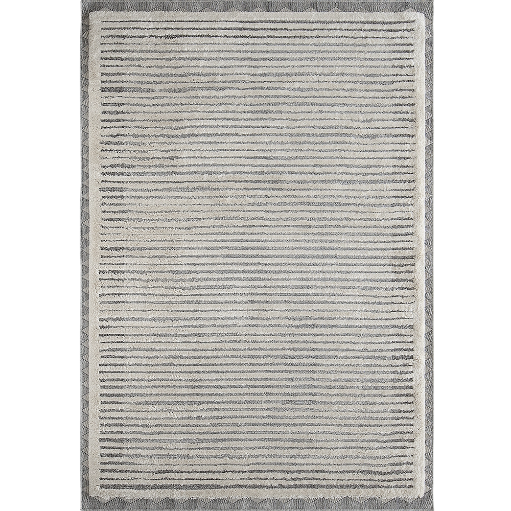 Этот ковер серого цвета и цвета слоновой кости изготовлен из синтетических волокон и представляет собой прочный и практичный вариант.