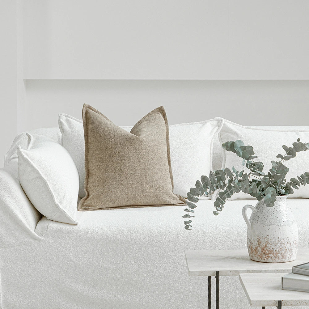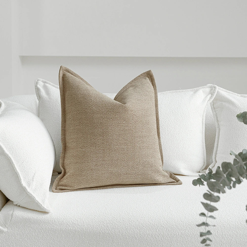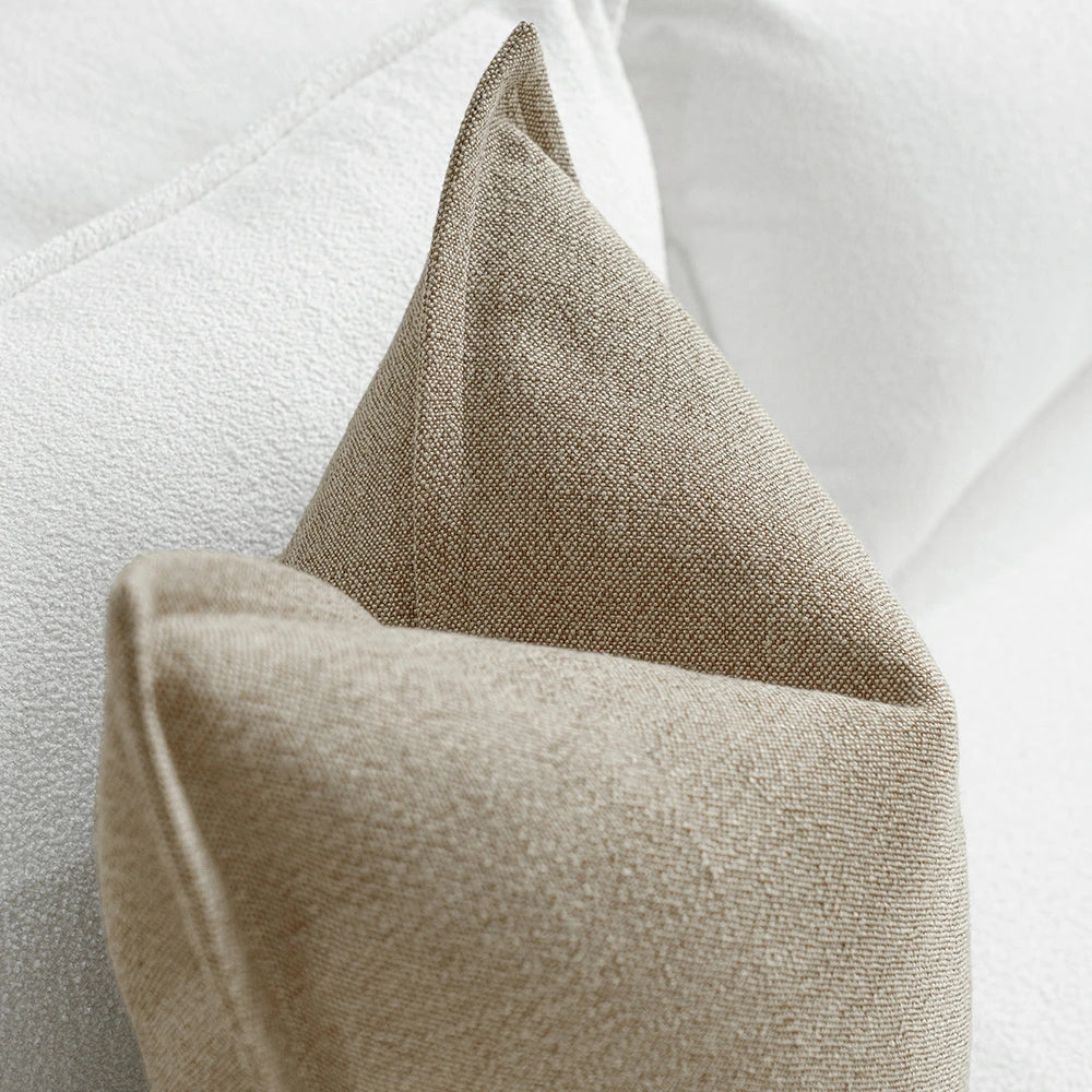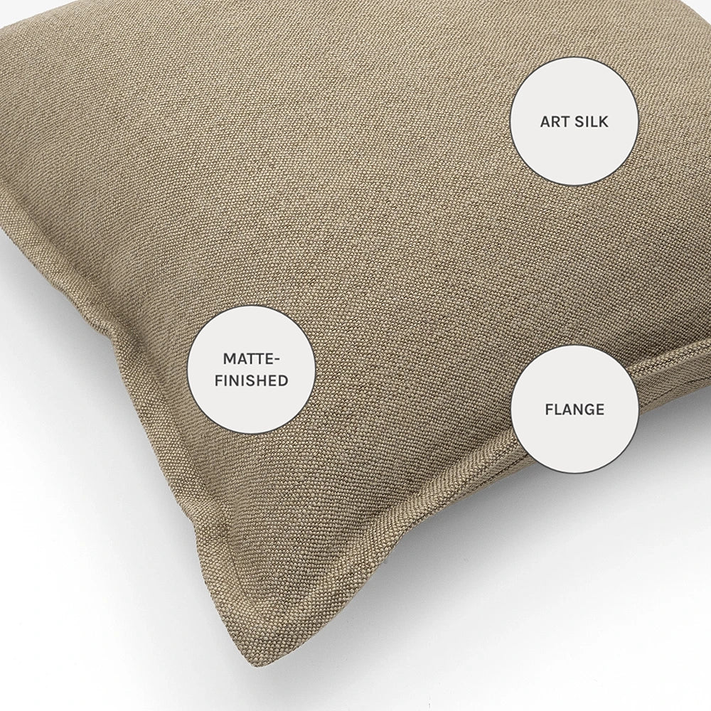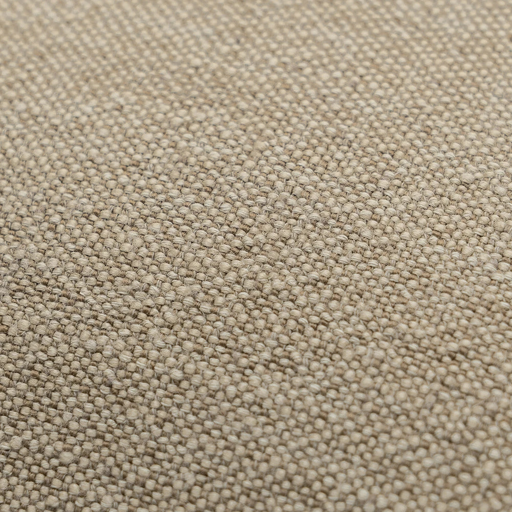Дизайн: Ткань, сотканная из тонкого сочетания пыльно-бежевых и более темных натуральных волокон, создает нежный двухцветный эффект, добавляющий сдержанной глубины. Отделка льняными краями в тон ткани обеспечивает цельный, сдержанный вид, который легко сочетается как с фактурными, так и с однотонными подушками.
