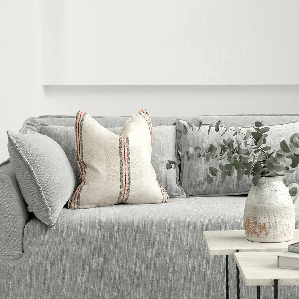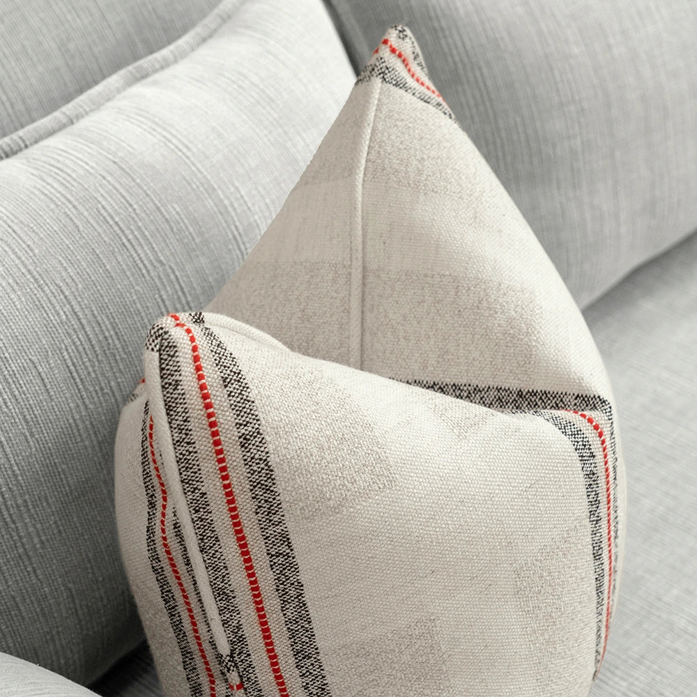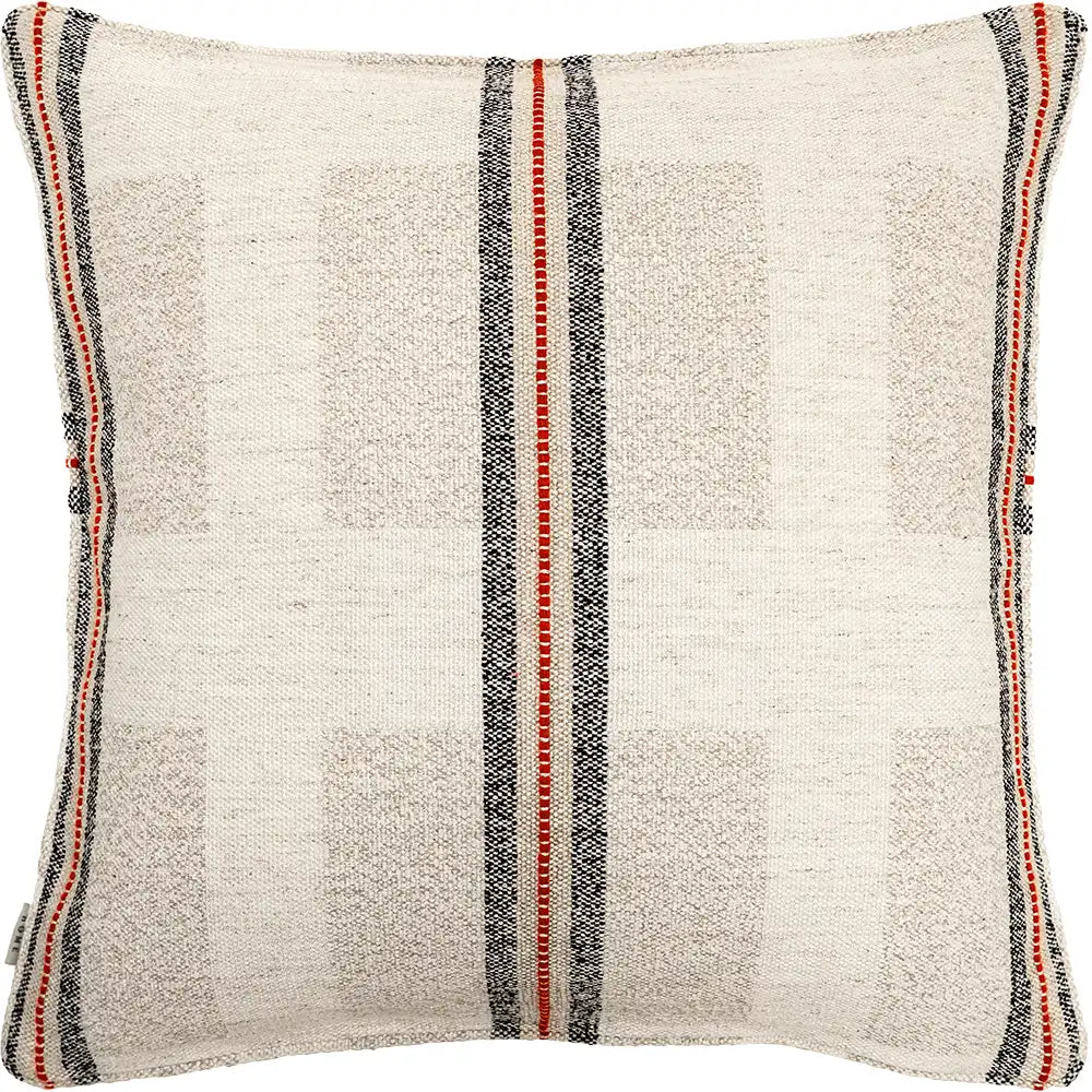 Красивая фактурная подушка, сотканная из мягкой, натуральной ткани с едва заметными тональными блоками и смелыми контрастными полосами. Ткань обладает непринужденной, ручной работой — легкая, но при этом структурированная — и привнесет уют в любой интерьер.