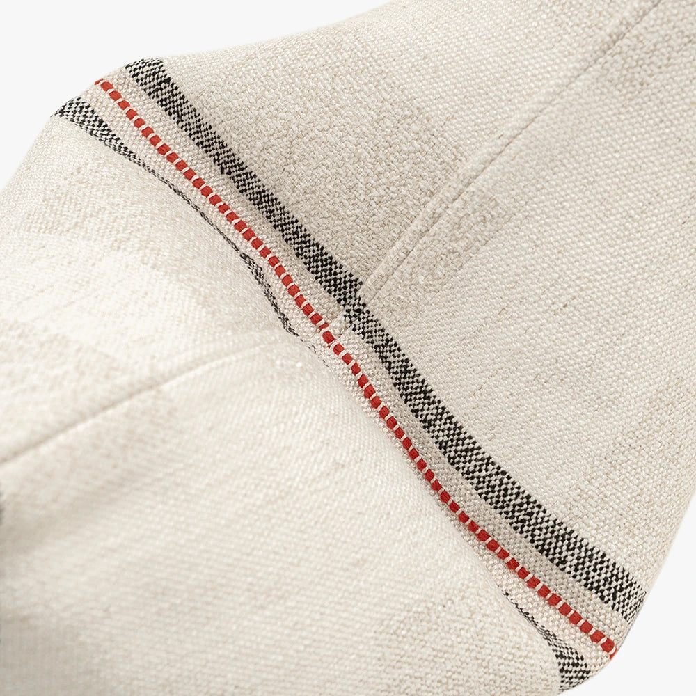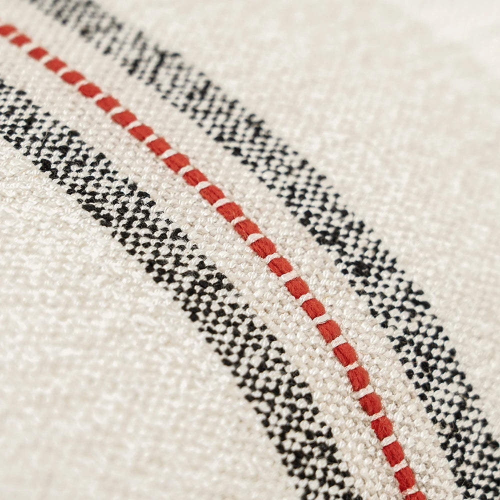 Дизайн: Ткань украшена тканым блочным узором, плавно переходящим в основной материал, обрамленным двойными боковыми полосами и узким центральным акцентом приглушенного красного цвета. Сочетание деталей угольного цвета и теплых оттенков создает изысканную, современную интерпретацию традиционных тканей ручного ткачества. Изнаночная сторона выполнена в том же плетении для создания целостного эффекта.
