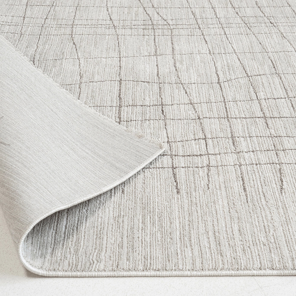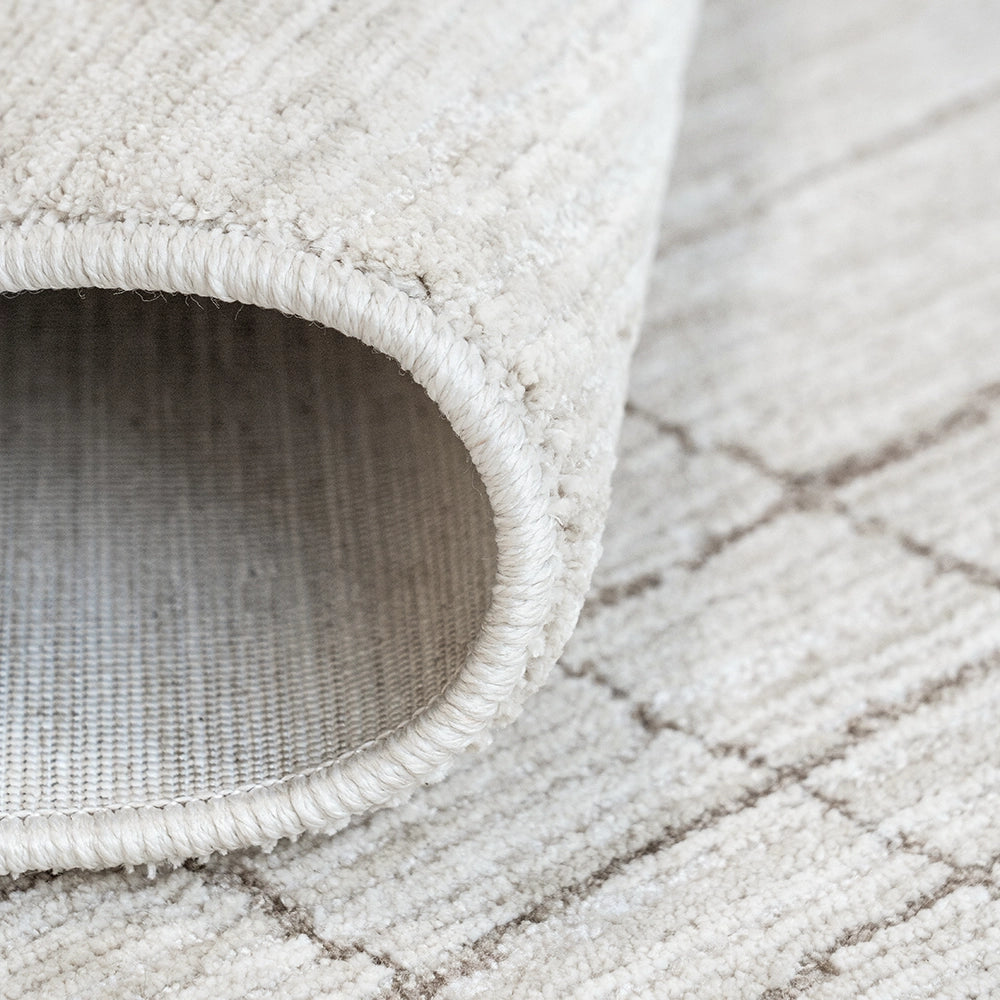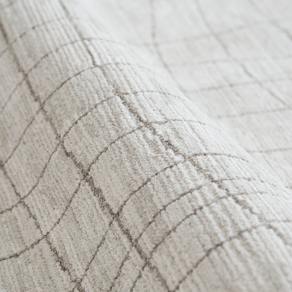 Современный ковер тёплого цвета слоновой кости с мягкими неровными линиями в светло-серо-коричневом оттенке. Нарисованная вручную сетка привнесёт лёгкое движение и сдержанную элегантность в любое пространство.